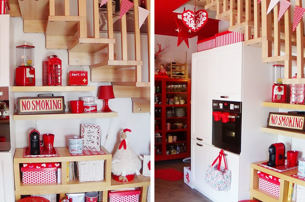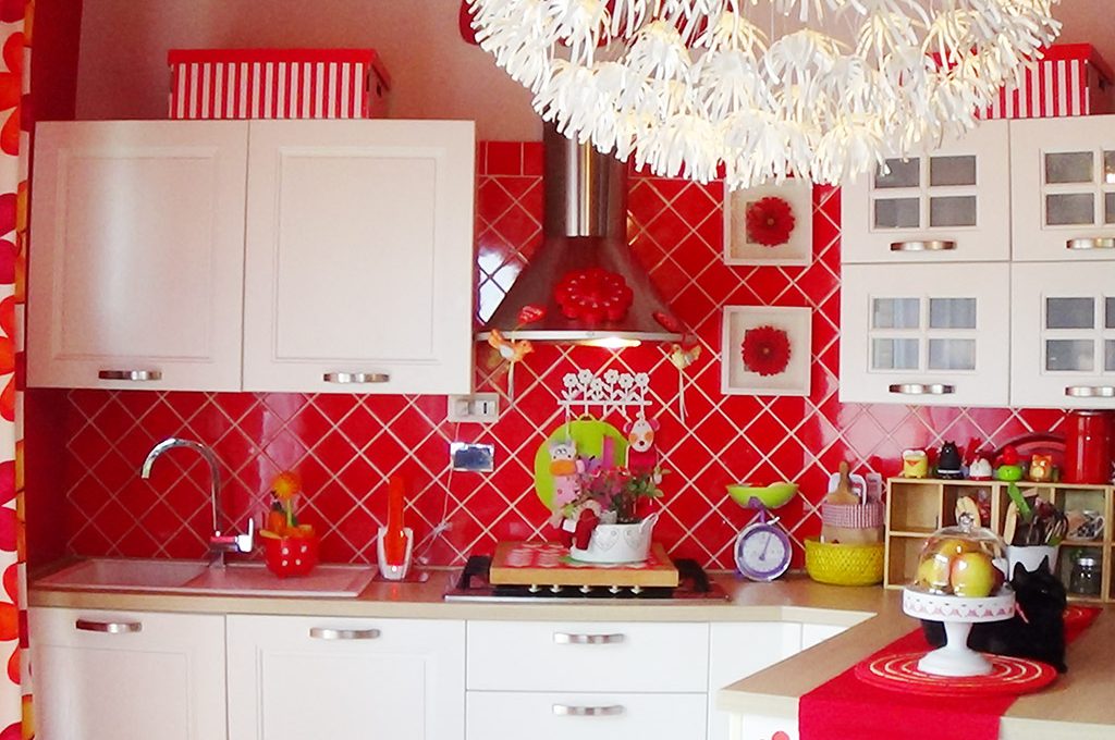 In cucina si trovano accessori e arredi rossi e bianchi a contrasto per un risultato coerente e omogeneo.