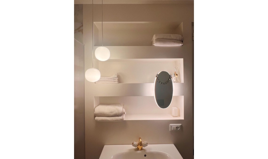 Dietro la porta a specchio (nella immagine precedente) si nasconde un bagno