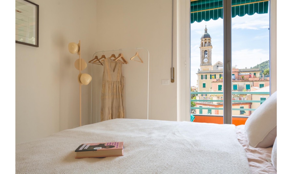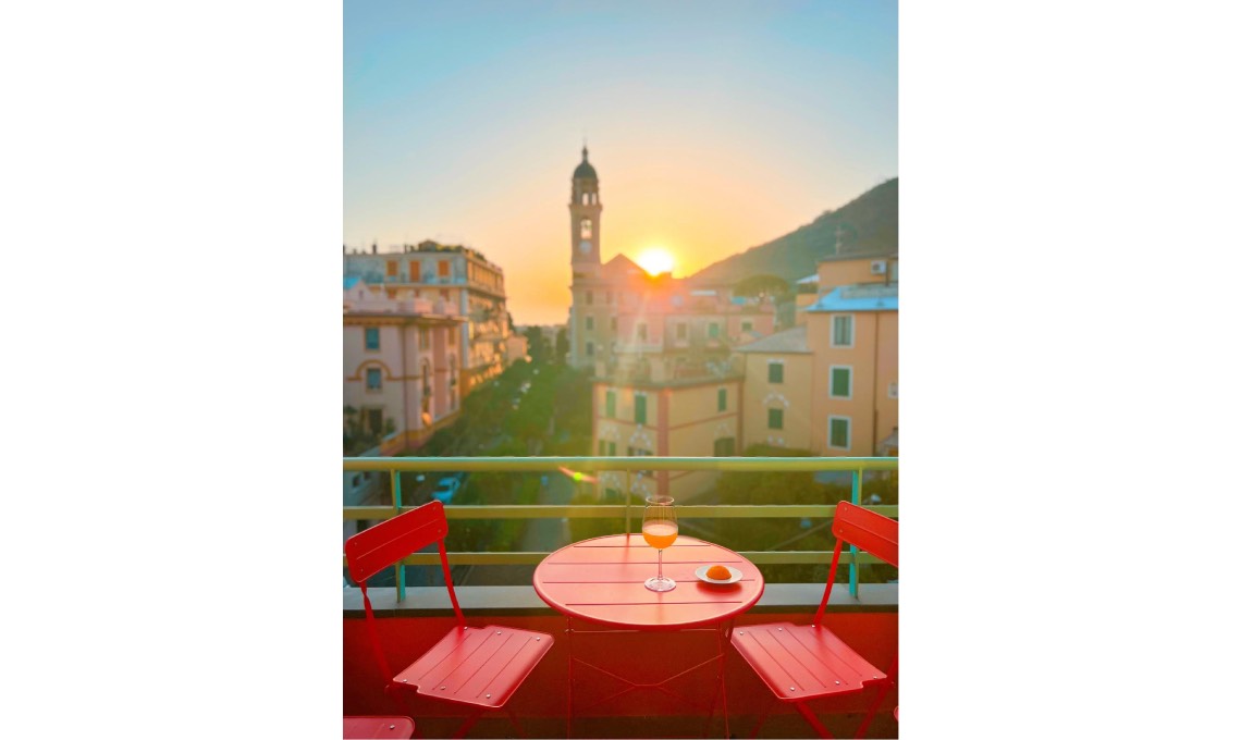 Il campanile che domina la visuale fuori dalla finestra è quello della chiesa di San Siro di Nervi. Un dolce risveglio! Lampada stile vintage [Maisons du Monde].