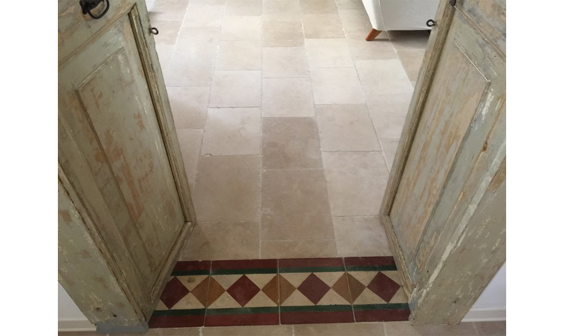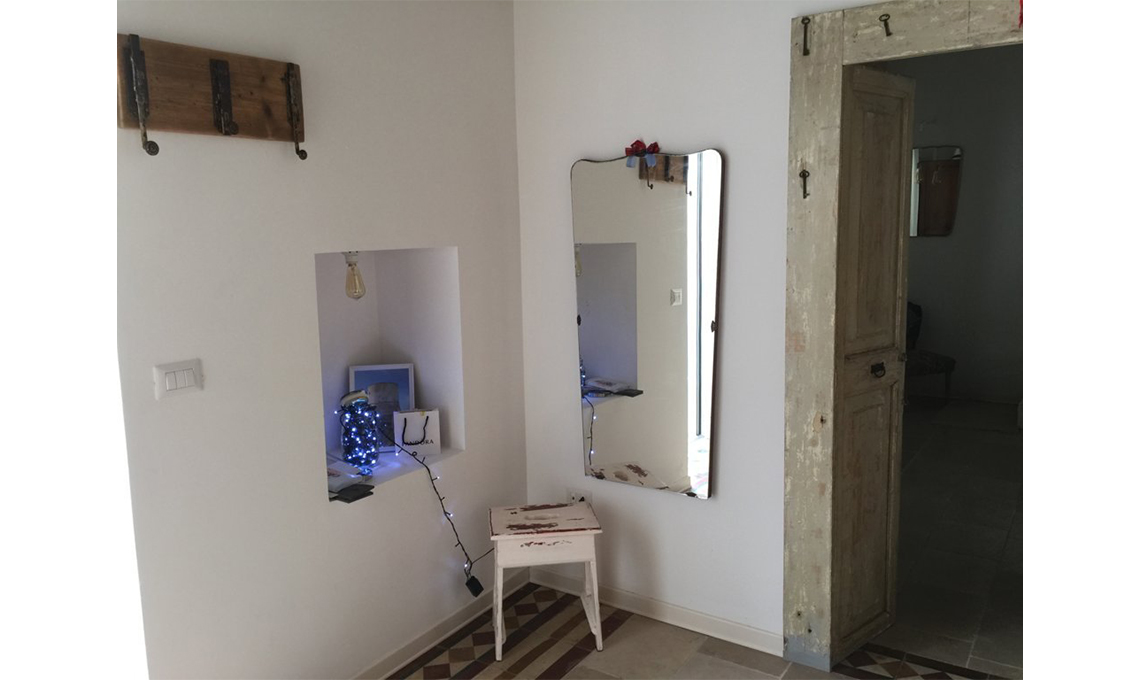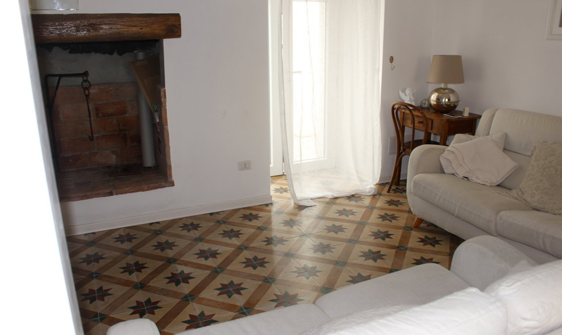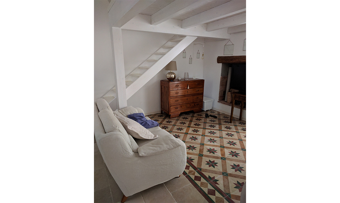 «Poi ho iniziato a cercare i pavimenti in cementine originali dalle vecchie case delle mie zone, ho trovato due bellissimi pavimenti e li ho usati uno nella cucina e l’altro in soggiorno; il resto della pavimentazione della casa è realizzato con pietra di Trani.