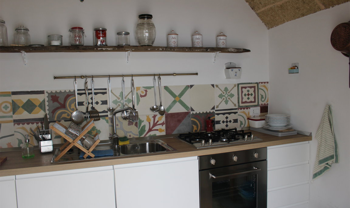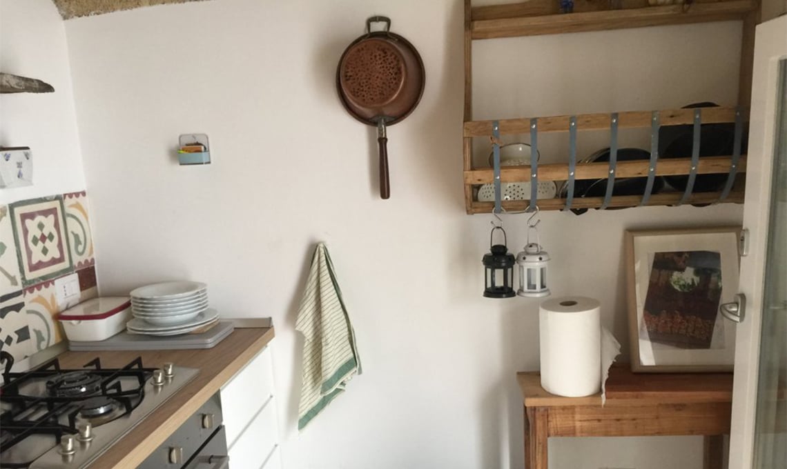 La cucina ho deciso di ricavarla in una stanza fuori dalla casa, nel cortile: lì, dai racconti dei miei nonni so che le signore del paese si riunivano a ricamare.