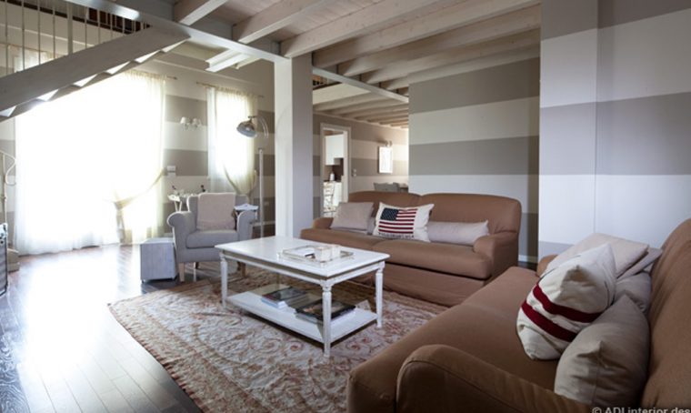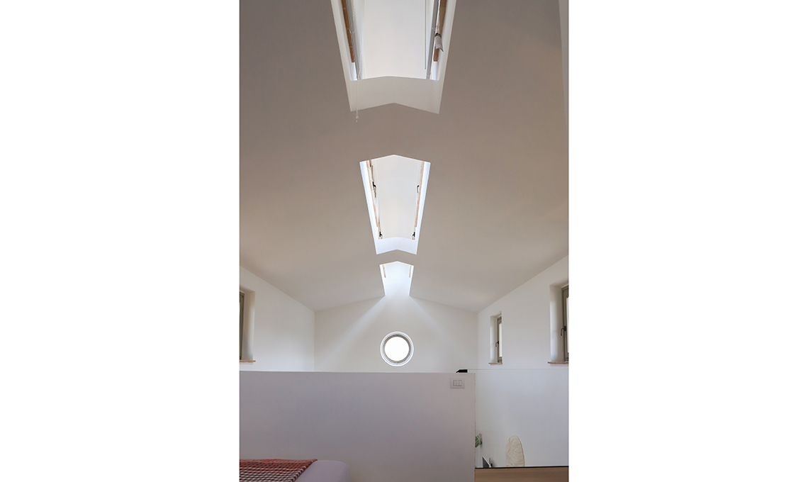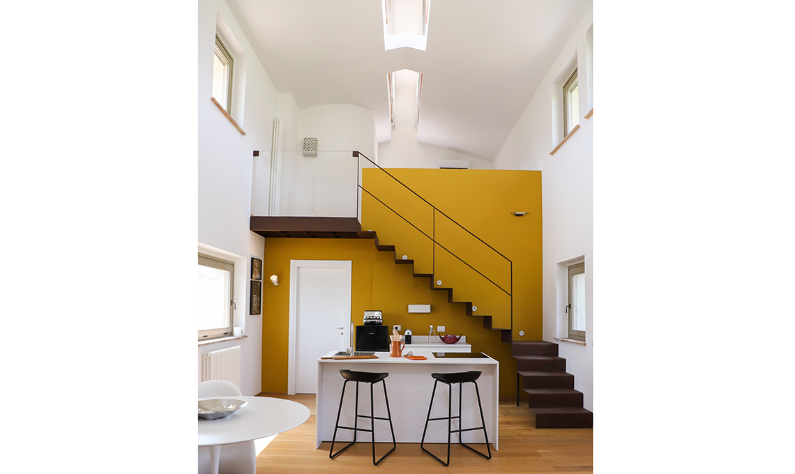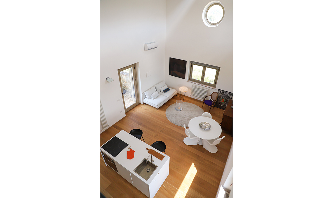 Il casale è stato diviso in due appartamenti ampi e luminosi in cui lo spirito del tempo incontra la modernità. Due soppalchi moderni ai lati lasciano la zona centrale a doppia altezza con un effetto molto scenografico.