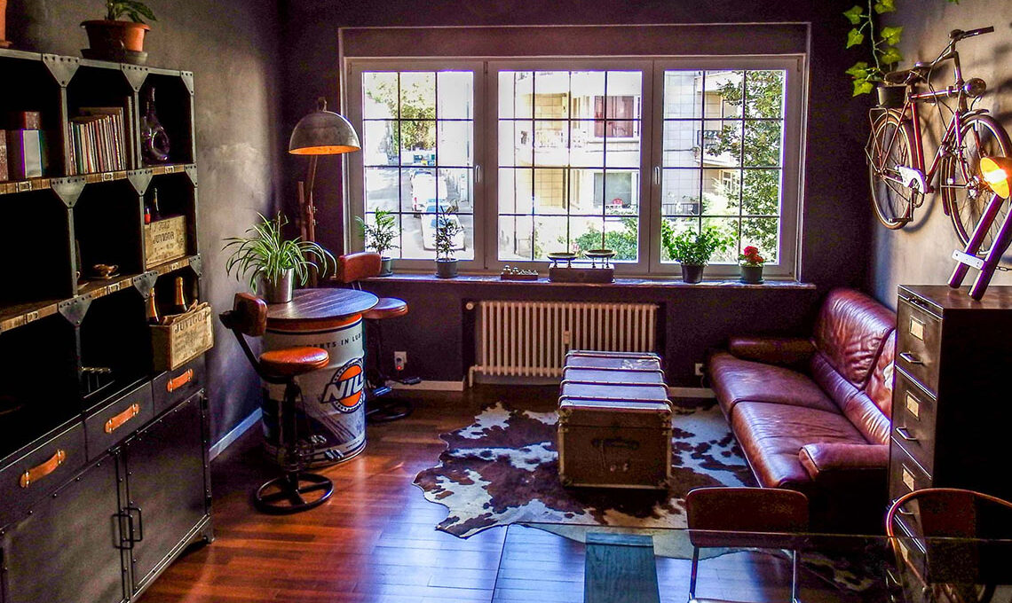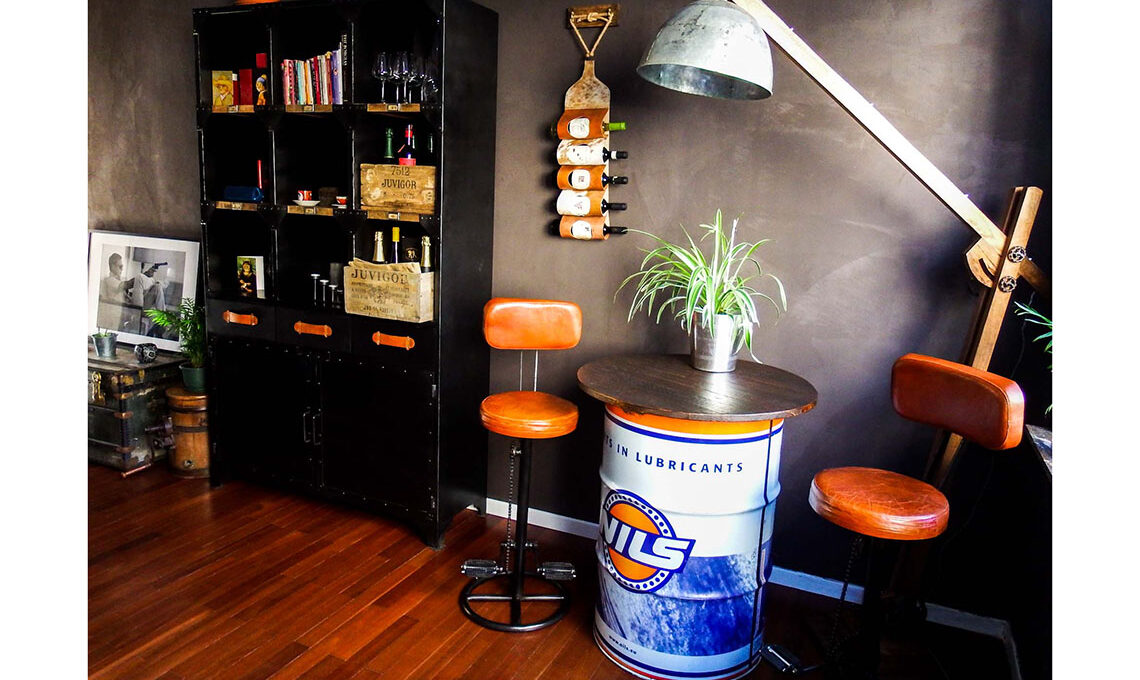 Gli arredi sono stati scelti in un mix tra vintage e nuovi ma sempre rispettando lo stile scelto. Ogni elemento è stato selezionato affinché rievocasse gli ambienti industriali: il divano in pelle, un vecchio baule come tavolino, pareti scure, gli elementi in acciaio scuro, sgabelli da bar, lampadine a vista, pavimento in legno...