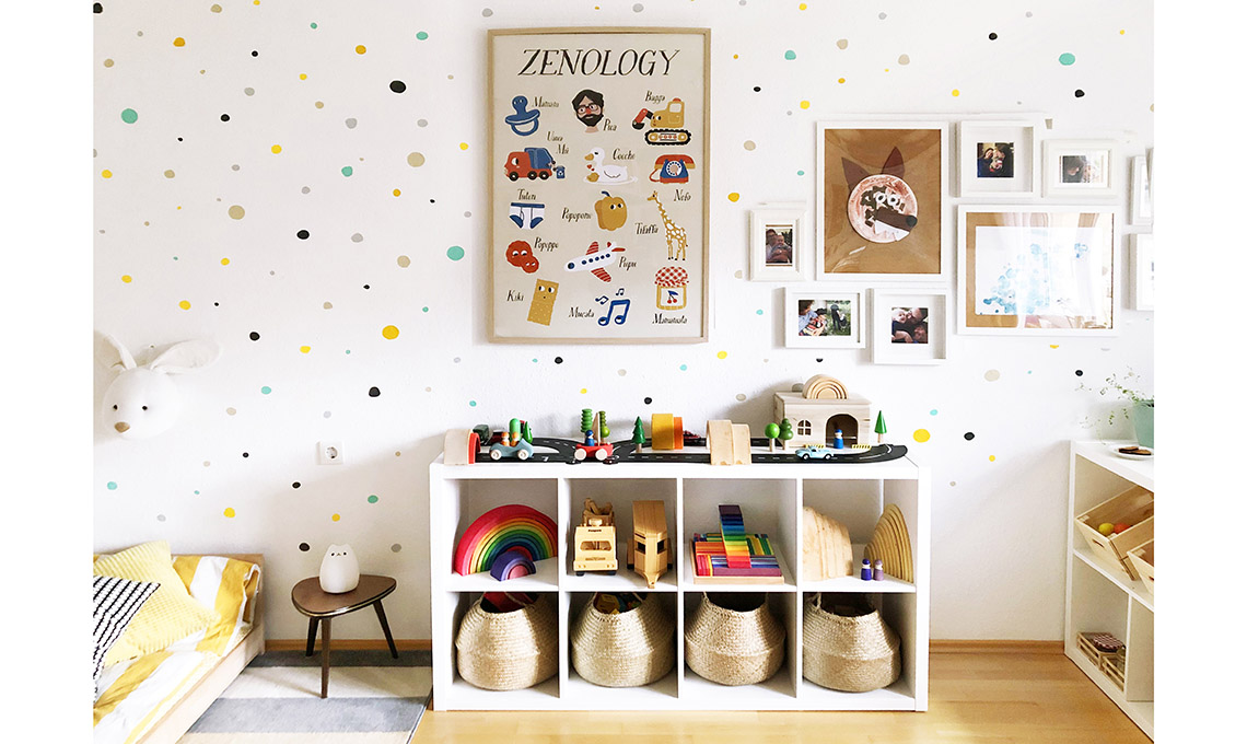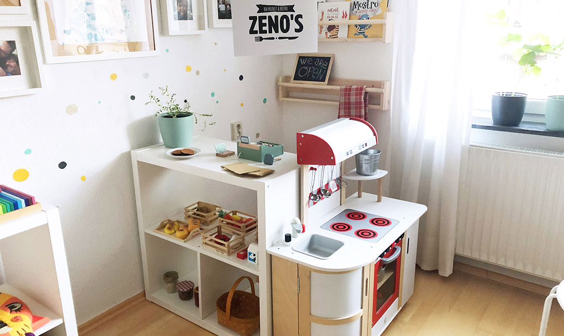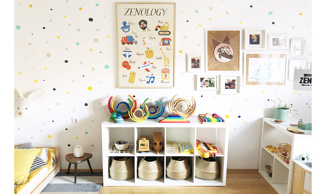 Siamo nella cameretta di Zeno, 3 anni dove la sua mamma Anna ci racconta come ha organizzato lo spazio: "Tutto è stato pensato per essere modificato in base agli interessi di Zeno e per creare piccoli allestimenti sempre nuovi, come il 'Market & Bistrot Zeno's', un piccolo supermercato bio con angolo cucina, dove lo chef serve la sua specialità: biscotto di feltro con fagioli secchi! O come la zona art&craft, dove un carrello da cucina Ikea funge da contenitore di tutti i nostri materiali artistici."