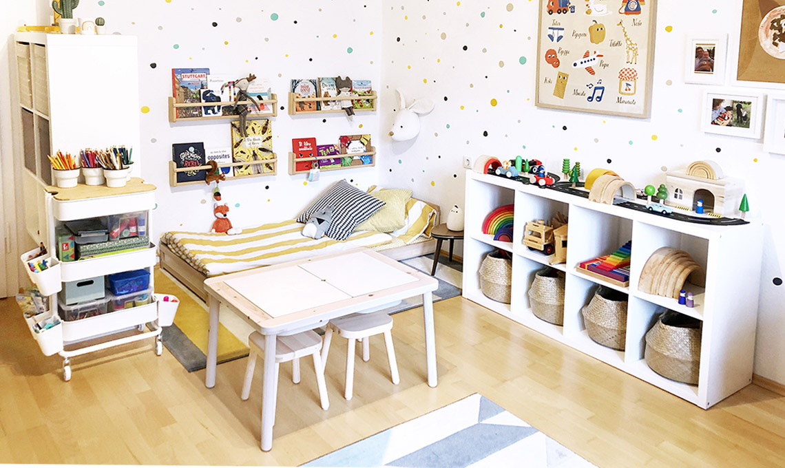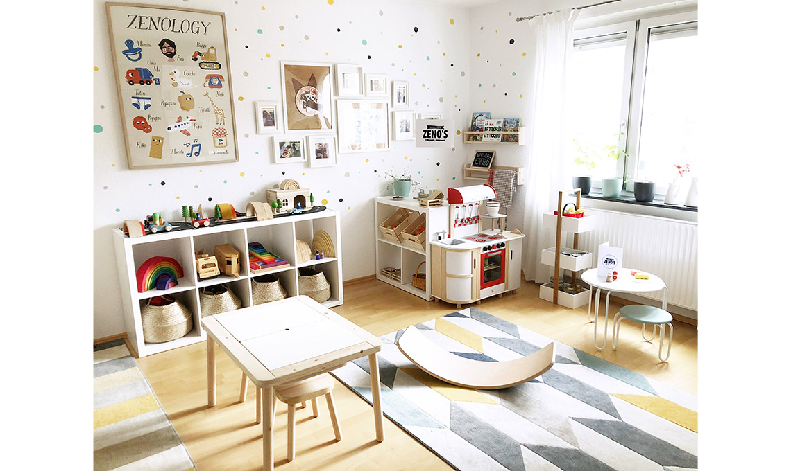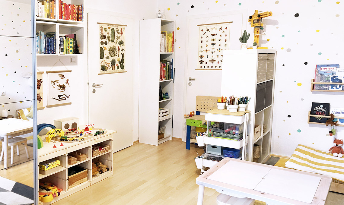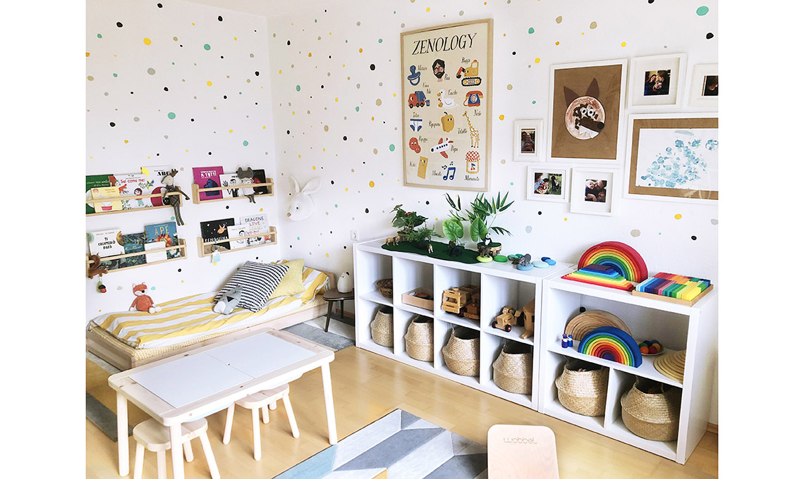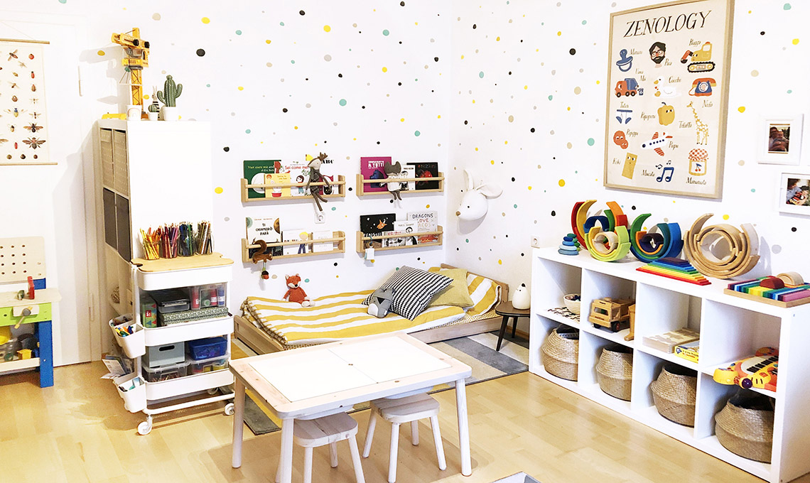 Uno spazio di ispirazione Montessoriana, dove gli elementi di arredamento (quasi interamente Ikea) fanno 'un passo indietro', per servire il loro scopo principale: permettere l’accesso libero a materiali, giochi e libri, la concentrazione e l’espressione libera.