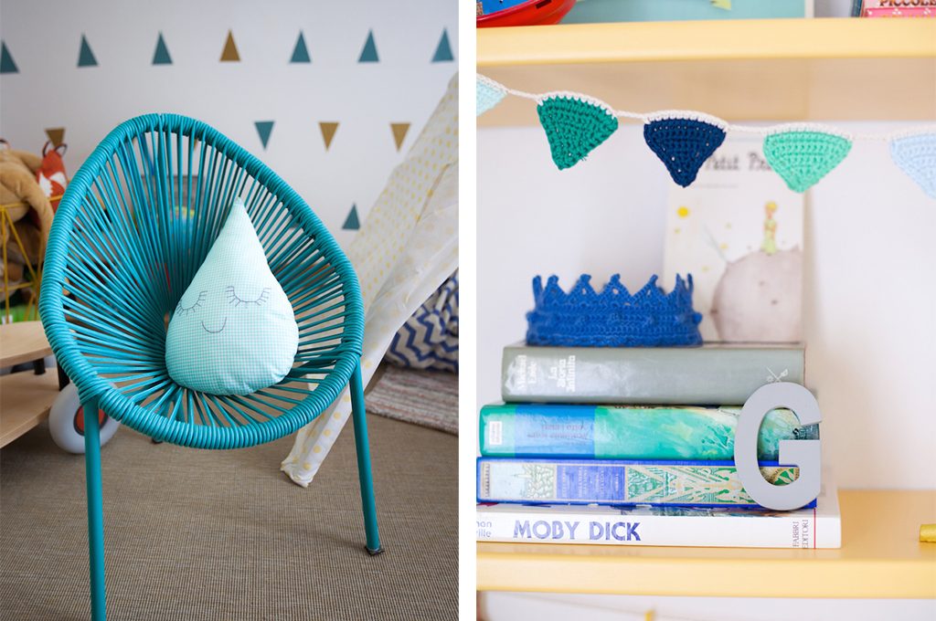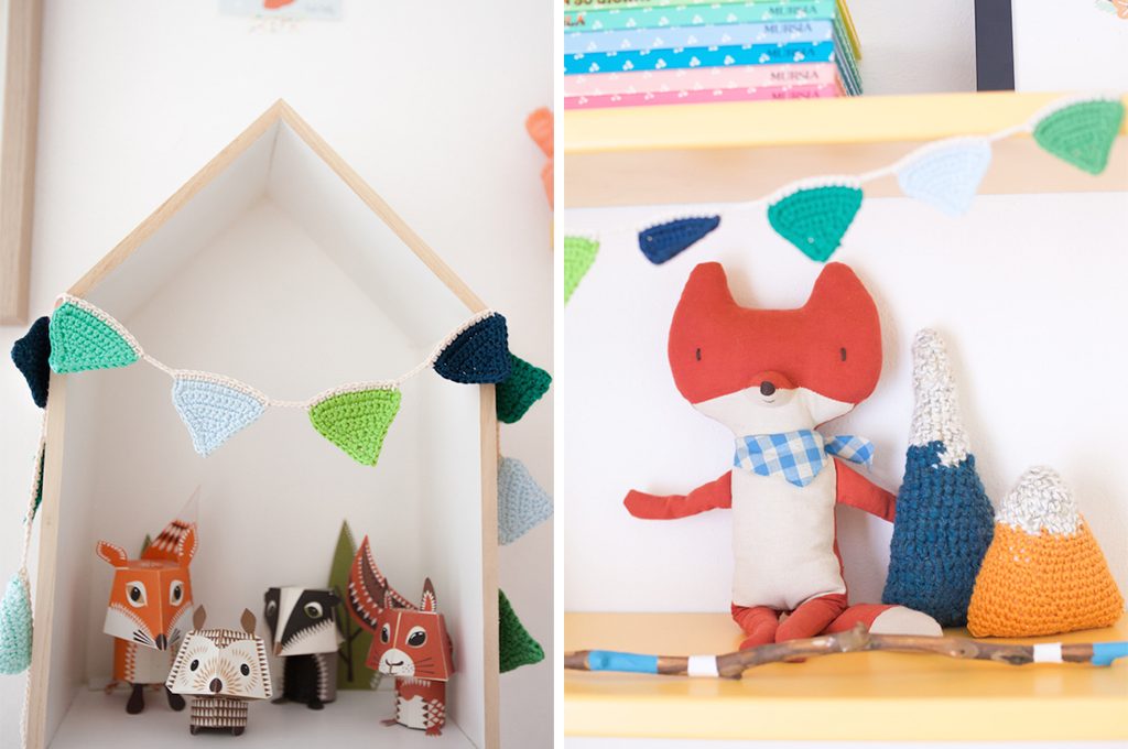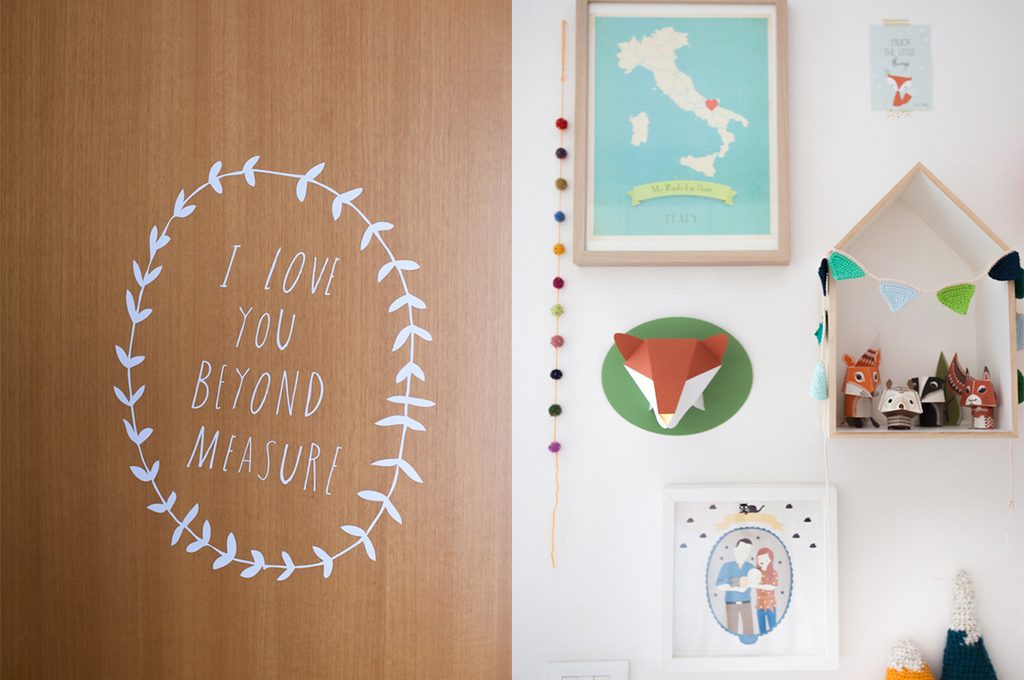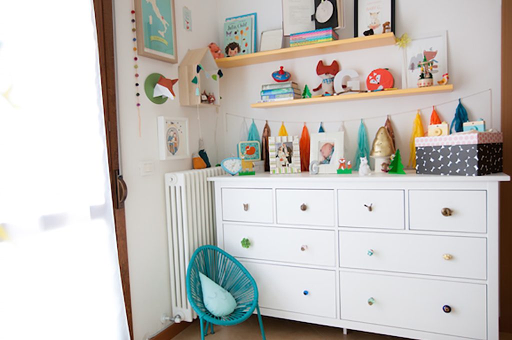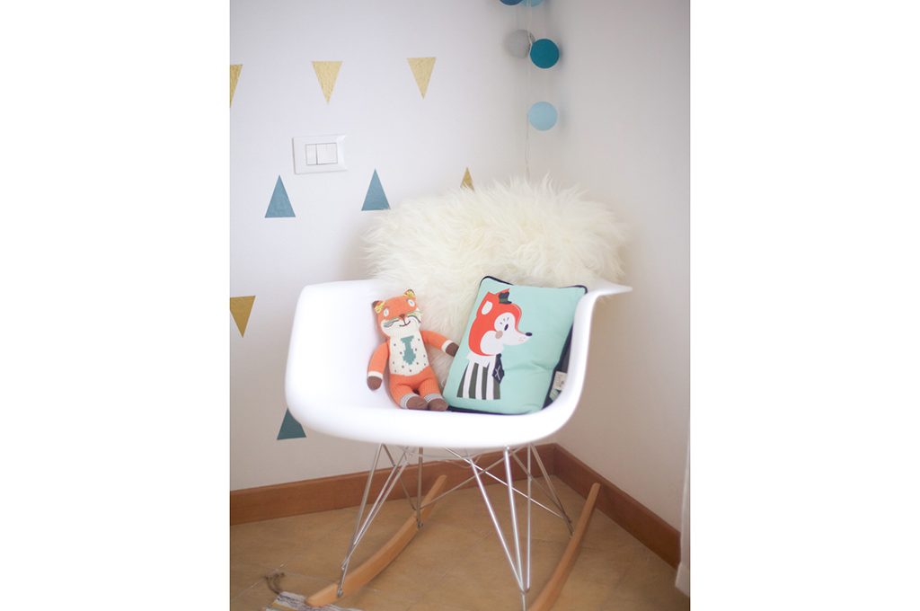 una cameretta moderna, colorata e popolata dagli animaletti della foresta: la volpe, appunto, ma anche leprotti, ricci, cerbiatti… Nella cameretta esisteva già un grande armadio a muro con i cassetti color melone e due mensole abbinate. E io ho aggiunto dei tocchi di azzurro, dorato e giallo.