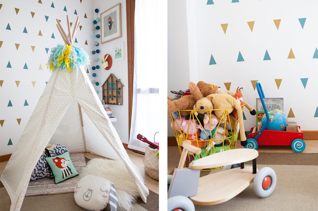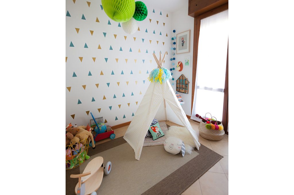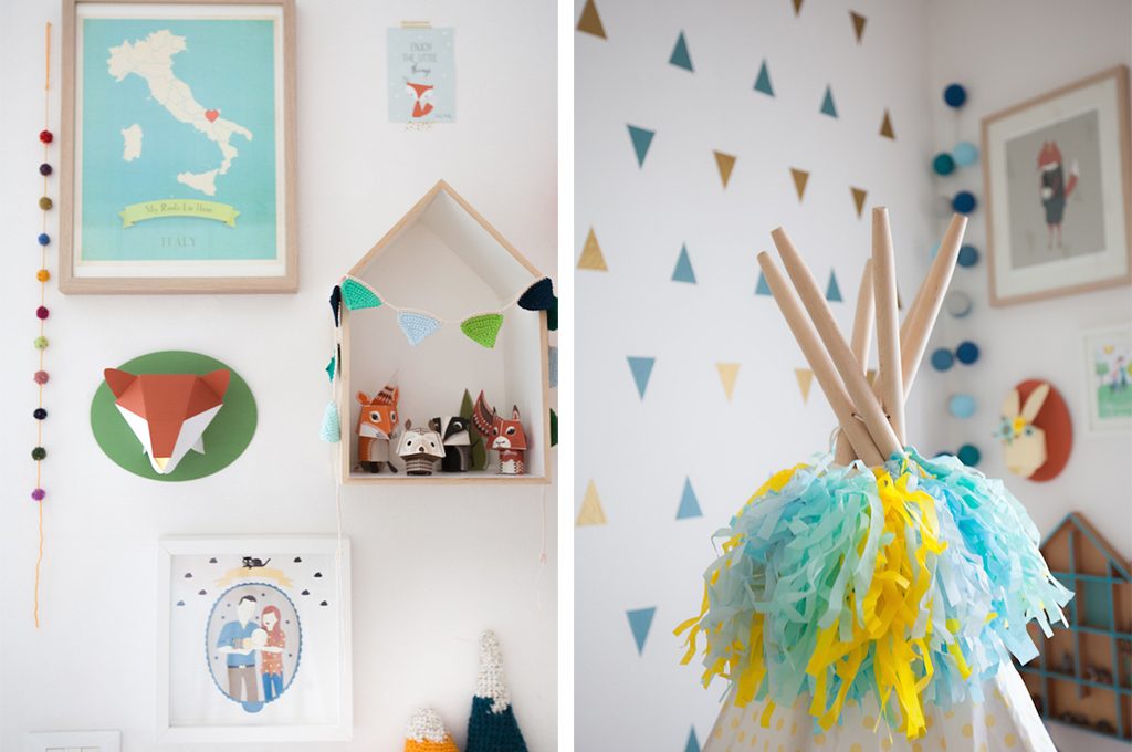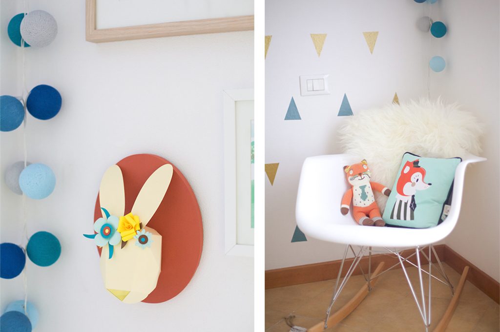 muro con gli sticker a triangolo di Wall by Mur. Hanno dato tutta una nuova faccia alla cameretta! E poi sono venuti pian piano tutti i dettagli: qualcosa di comprato, tantissimi regali e qualche DIY! Col tempo ho sostituito la culla con un lettino e poi trasferito il lettino in camera da letto e messo nella cameretta una tenda gioco».