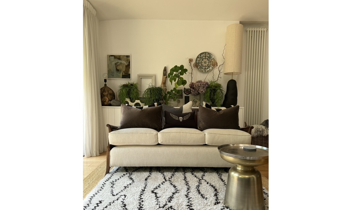 Nella garden room il divano fa parte di una ‘bergère suite’ dell’inizio del secolo scorso, trovato su eBay e rifoderato in tessuto di lino color sabbia. Il tappeto e il tavolino in metallo sono di West Elm. Dietro il divano c'è una lunga credenza fatta su misura. Sopra il mobile Carla ha posizionato una serie di piante dando continuità tra l'ambiente esterno e quello interno. La lampada alta è di Ferm Living, il modello con le foglie dorate è di artigianato sardo. Il piatto alla parete è un oggetto di artigianato di Taormina.