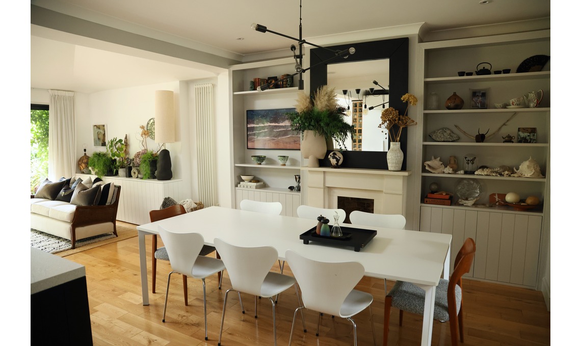 La casa di Carla è a Blackheath, nella zona sud-est di Londra: un grande open space accoglie cucina, sala da pranzo, living. «Quasi tutto quello che si vede sopra gli scaffali della libreria/credenza sono oggetti acquistati o trovati da me durante i nostri tanti viaggi» racconta la proprietaria. «Il tavolo è di Gubi e mi piace per la sua semplicità così come le sedie bianche, che sono il modello originale di Fritz Hansen, Serie 7. Le due sedie a capotavola sono le originali, vintage, di J.L. Møller, rifoderate con stoffa di Kirkbydesign».