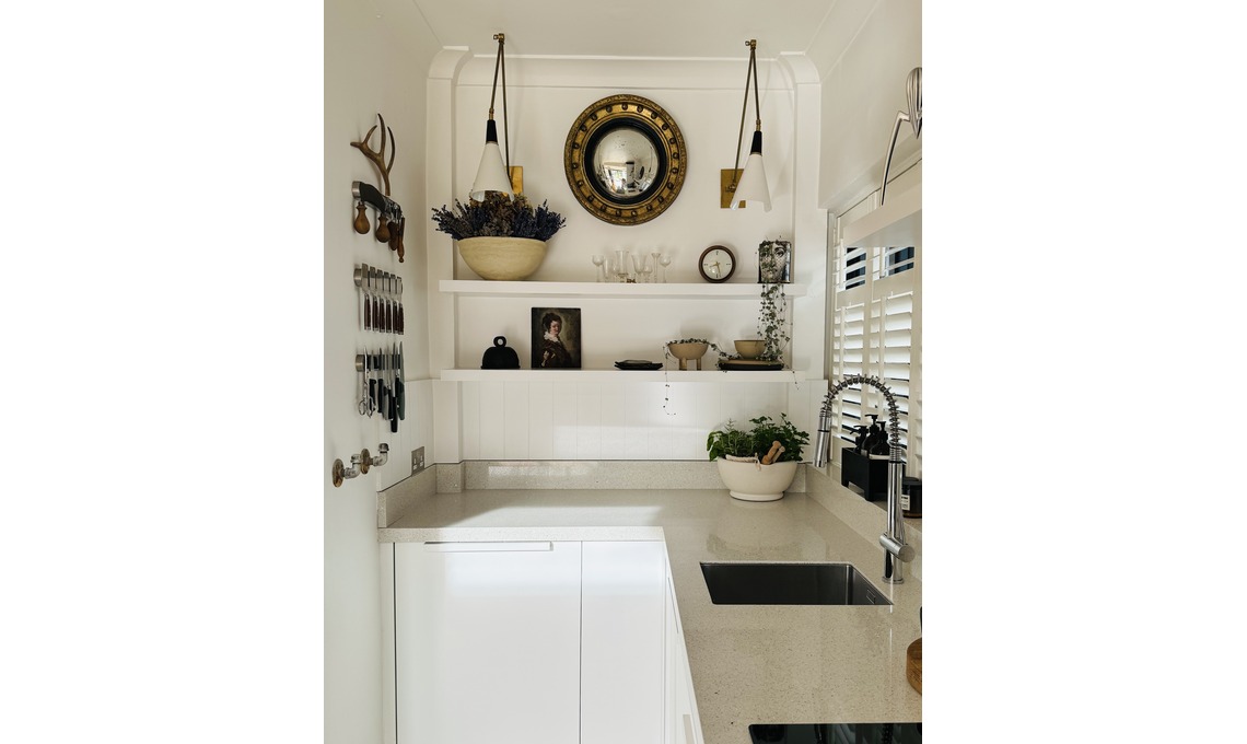 Cucina: «È stata fatta su misura dal nostro falegname seguendo il mio progetto. Le due applique sono un acquisto vintage sul sito Etsy, mentre lo specchio è del periodo Regency, trovato in un negozio di antiquariato in un piccolo paesino nella campagna inglese».