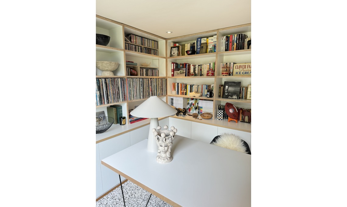 Garden office/ufficio: «Il mio ufficio e si trova in fondo al giardino, dalla parte opposta della casa principale. Il design della libreria è ancora una volta il mio, sempre realizzata dal nostro fidatissimo falegname. La scrivania è di Made.com, la lampada è di Lightsandlamps.com. Passo più tempo in questo ufficio nei mesi estivi mentre d’inverno preferisco lavorare dal mio ufficio dentro casa, al primo piano».