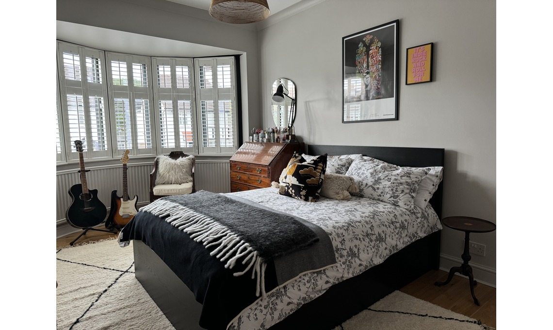 La camera della figlia di Carla, musicista: le chitarre sono una Squire stratocaster e una Yamaha acoustic. Sedia e scrittoio sono di famiglia: il letto è di Ikea, lo specchio sopra lo scrittoio è di Zara Home. Sopra lo scrittoio c'è la lampada Anglepoise originale mentre il lampadario è di Pooky Lighting. Il tappeto è un altro Beni Ourain.