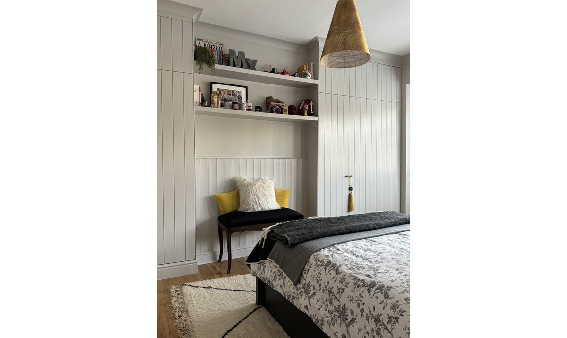 Camera da letto con bay window: «Questa è la camera di mia figlia. È una musicista e le due chitarre sono le sue (a quanto pare sono le meno ‘preziose’ della sua collezione e sono una squire stratocaster e una yamaha acoustic). Anche qui convivono pezzi di antiquariato di famiglia, quali la sedia, la panca e lo scrittoio, con arredamenti moderni: il letto è di Ikea, lo specchio sopra lo scrittoio è di Zara Home. Ci sono cuscini di Zara Home (sulla sedia) e di Rockett St. George (sul letto). Sopra lo scrittoio c'è la lampada Anglepoise originale mentre il lampadario è di Pooky Lighting. Il tappeto è un altro Beni Ourain. L’armadiatura-boiserie è stata realizzata dal nostro falegname, il design è il mio».