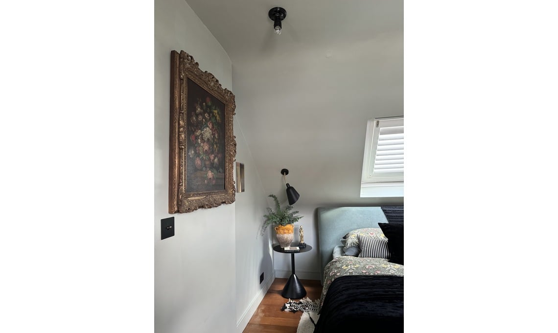 Camera matrimoniale in mansarda: «Il colore più usato sulle pareti di casa è il neutro Cornforth White di Farrow and Ball. Nella camera matrimoniale ho voluto però usare Blue Grey di Farrow and Ball, prendendo come spunto il quadro di famiglia antico con cornice dorata. Questa aggiunta di colore è per me abbastanza inusuale. Trovo però che sia un colore molto ’soft’ e che mi rilassa. Il letto matrimoniale, con rivestimento in velluto dello stesso colore delle pareti, è di Heal’s di Londra. L’applique sopra il letto è la Bellevue AJ19 di Arne Jacobsen. Il comodino in metallo nero è di Kave Home. Sopra il tavolino, la statuina è stata acquistata al mercatino/show di Midcentury Modern di Londra, mentre il vaso è un pezzo francese del XIX secolo, trovato in un negozio di antiquariato di Lewes, nell’East Sussex inglese. C'è poi ancora una volta un tappeto Beni Ourain marocchino. Gli altri quadri nella stanza sono di un artista di Greenwich che si chiama William Wylde».