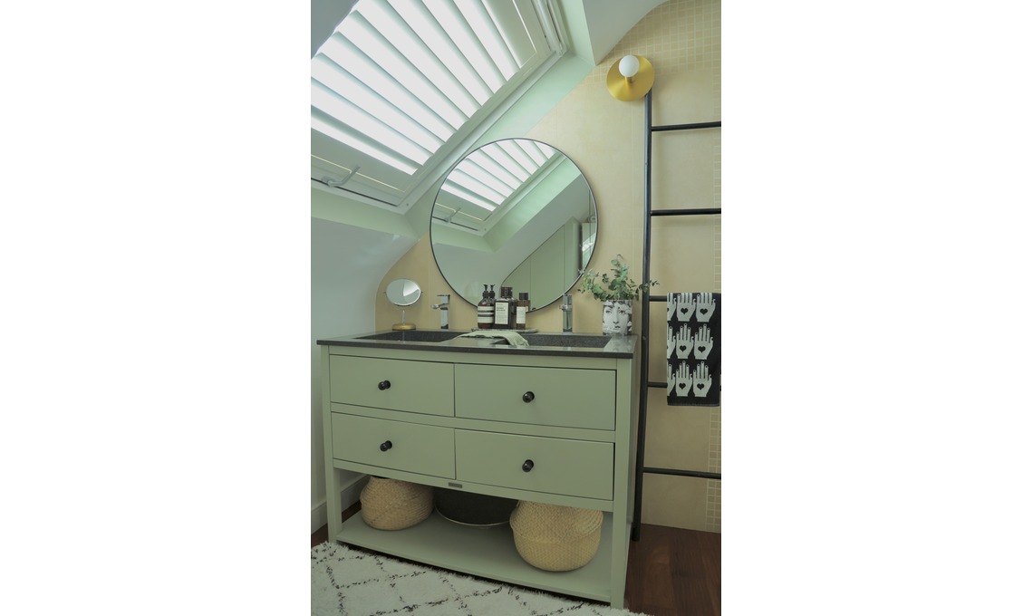 Nel bagno-doccia padronale Carla ha usato lo stesso colore Blue Grey della camera, anche per il mobile/vanity unit di Harvey George. Applique in ottone presa sul Spark & Bell. Specchio Habitat, asciugamani Rockett St. George.