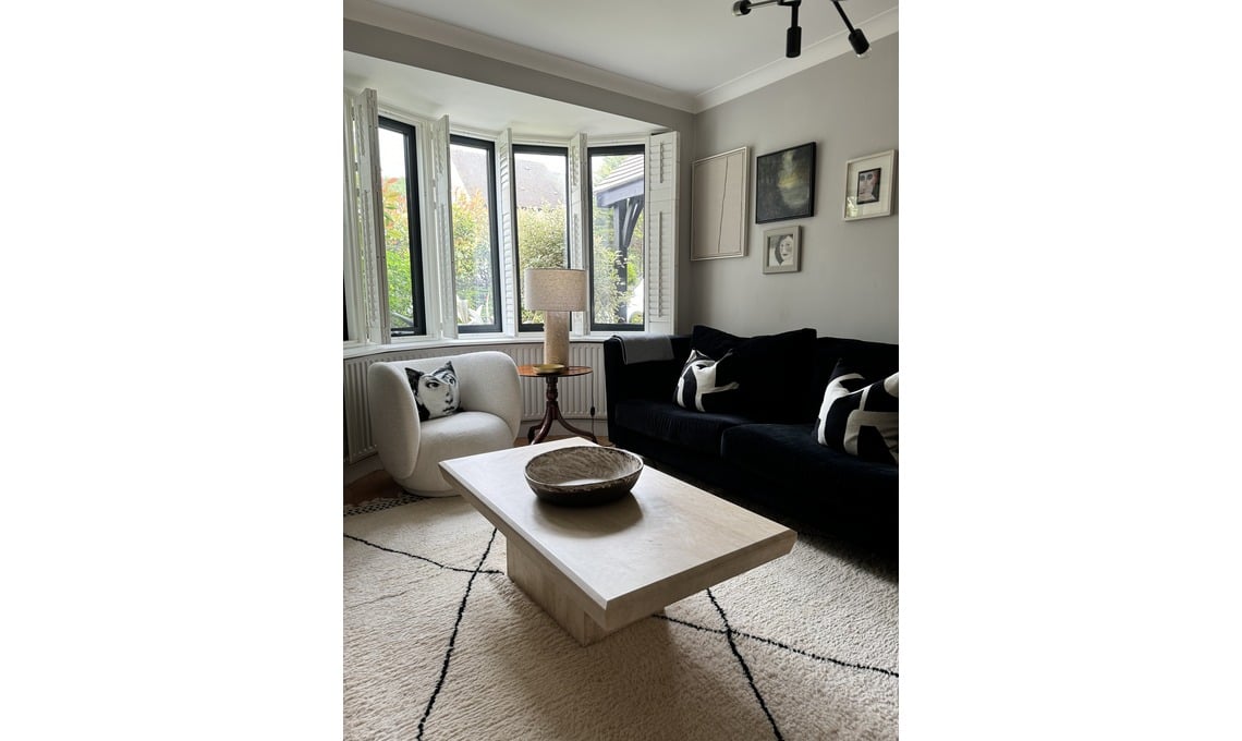 Soggiorno: «Il divano in velluto nero è di Raft Furniture. La scelta del colore è stata dettata più che altro da motivi pratici ma anche dal fatto che mi piace molto il colore nero abbinato a colori neutri chiari. Le due poltroncine in lino beige sono di Soho Home, così come la lampada in travertino; la poltroncina in tessuto bouclé è di Ferm Living. Il tavolino da caffè è un pezzo di recupero vintage anni '70. I cuscini sul divano e sulle due poltroncine sono del sito Sophie Home, quello sulla poltrona di Ferm Living è un cuscino Fornasetti. Il tappeto è un Beni Ourain del Marocco».