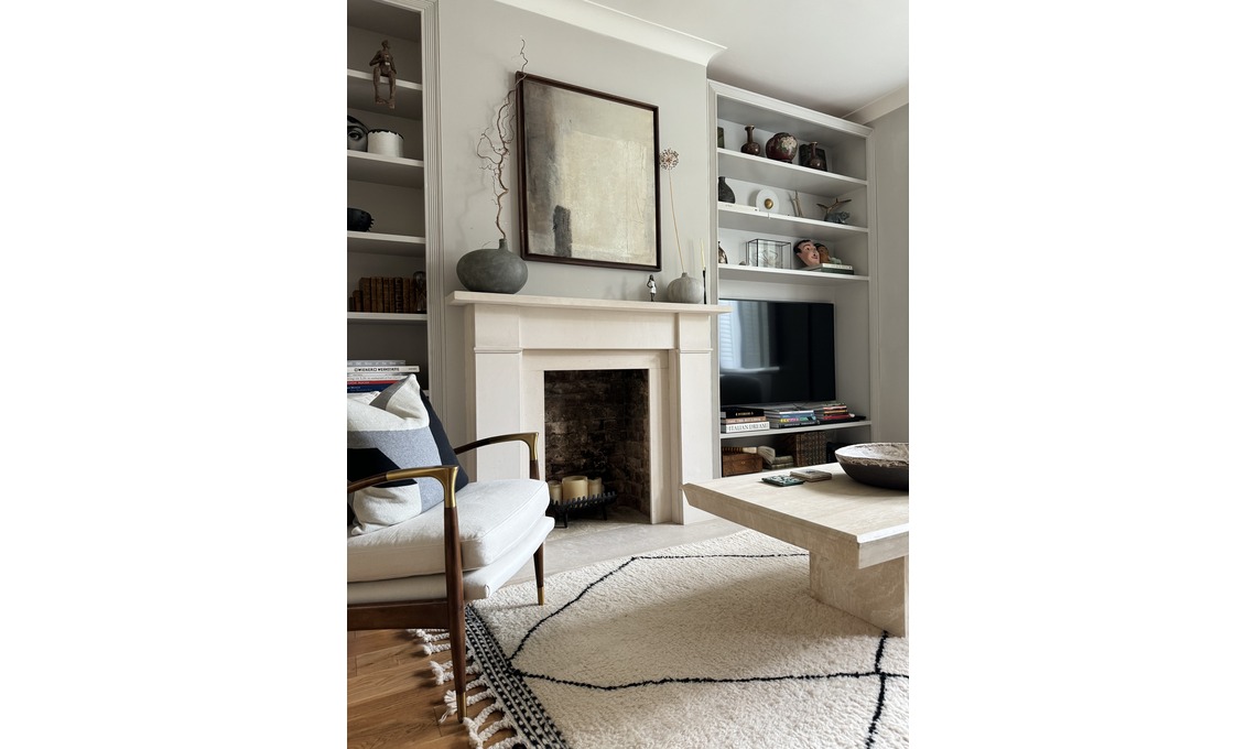 Nel soggiorno, davanti al camino due poltroncine in lino beige di Soho Home, così come la lampada in travertino. Il tavolino da caffè è un pezzo di recupero vintage anni 70. Cuscini di Soho Home acquistati sul sito Sophie Home.
