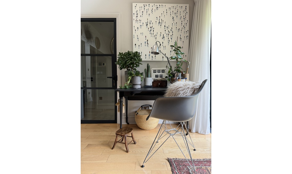 Nel piccolo angolo studio: la scrivania è un pezzo antico di famiglia, il quadro è dell’artista Henry Walsh, la sedia è originale di Charles and Ray Eames. Lampada ‘Counterpoise’ di Hadrill & Horstmann, di recupero vintage. La porta in legno nera a vetri è stata realizzata dal falegname.