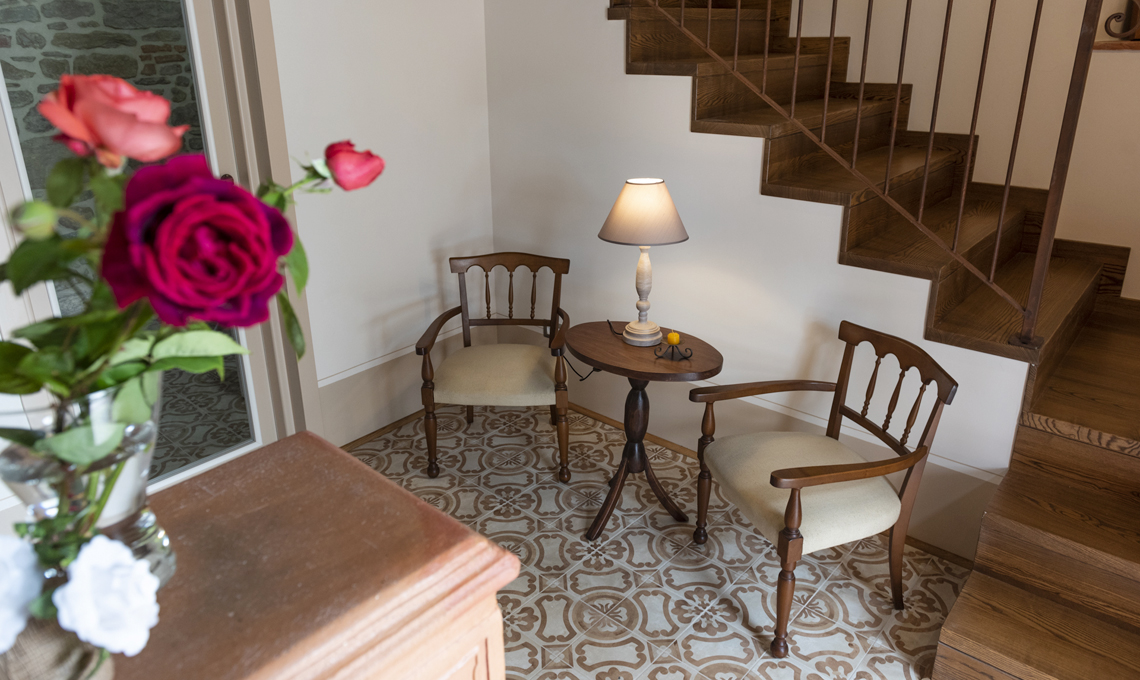 Al primo piano la ristrutturazione ha interessato completamente la cucina, con la sostituzione di pavimenti e rivestimenti e il bagno, lasciando come tema conduttore quello dei decori in gres effetto cementina.