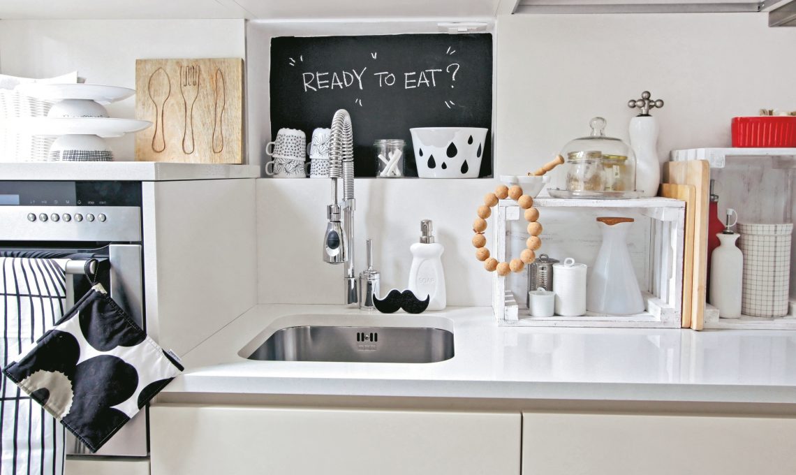 Proprio sopra il lavello, un’antiestetica rientranza si trasforma in geniale supporto di messaggi, esclamazioni e... liste della spesa, grazie a una mano di vernice lavagna. Viene riaffermato il pattern bianco/nero che, con l’aggiunta del verde salvia, serpeggia in tutta la casa, e qui compare su tazze e ciotola ‘personalizzata’ (Ikea), strofinacci (Ferm Living) e presine (Marimekko). Sul piano di lavoro, invece, due cassette per la frutta dipinte di bianco inquadrano barattoli e utensili come cornici tridimensionali: un ulteriore spunto da riprendere subito! Sottopentola in sfere di sughero Ferm Living, tagliere con posate Jardin d’Ulysse.