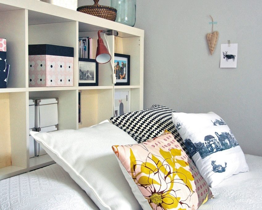 Sul letto matrimoniale trionfano cuscini ‘da soggiorno’: «Li adoro, perché non riproporli anche qui?» dichiara divertita la padrona di casa. Dai toni pastello (di una fodera comprata su etsy.com) al bianco e nero (Ikea), alle vedute di Venezia (Atelier Veneto), sul copriletto di famiglia si disegna una tavolozza di suggestioni e sfumature. La libreria Ikea, colma di scatole e fotografie, diventa poi un’indovinatissima testiera che separa riposo e lavoro. Scelta furba anche per chi vive in un monolocale…