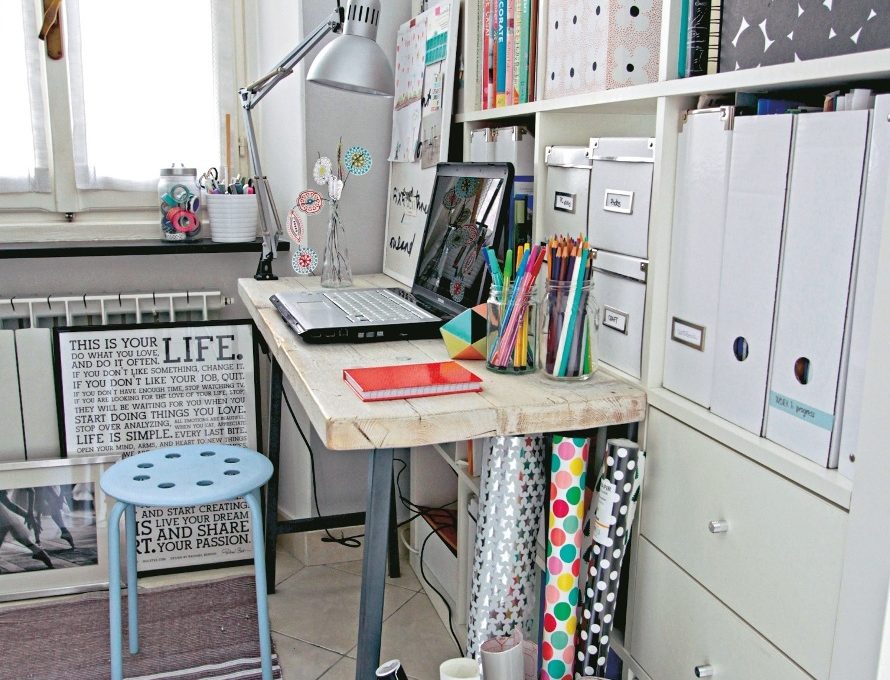 Quale postazione migliore per curare un blog d’arredamento? La zona studio rapisce in un arcobaleno di colori e incanta con la scrivania assemblata dal nonno, come il tavolo nel living. Per catalogare i documenti, accessori e scatole Ikea.