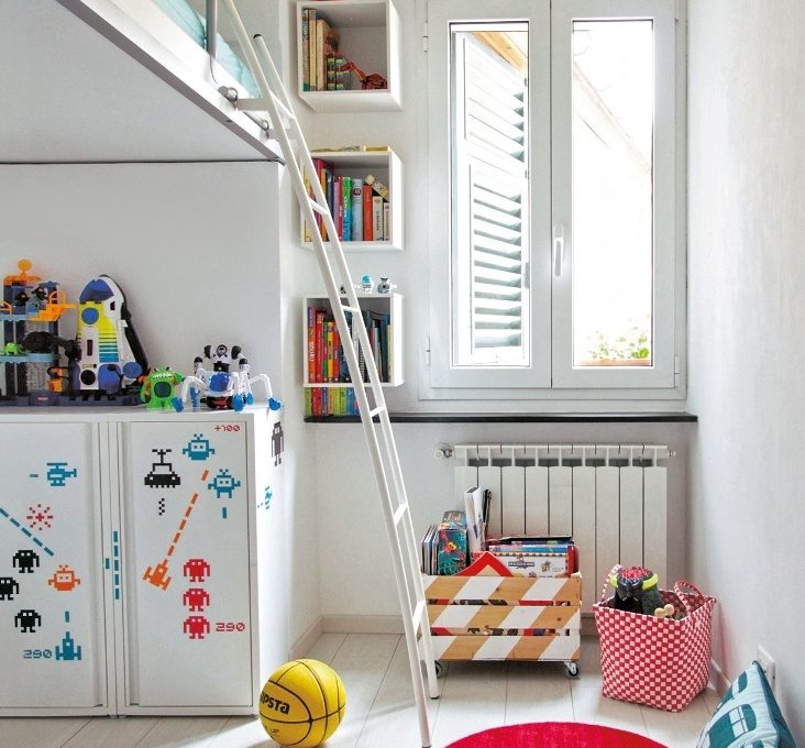 Come ‘ingrandire’ la stanza di Alberto? Semplice, moltiplicando i piani! Il letto (su disegno della mamma) è in alto e sul pavimento tappeti e cuscini sono pronti per le mille ‘acrobazie’ del piccolo! Cesta (Upim), cassetta fai-da-te e moduli a parete (Ikea) raccolgono infine giocattoli e libri.