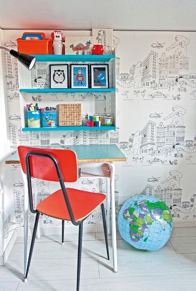 La grafica della tappezzeria acquistata su cartadaparatideglianni70.com e degli accessori (fra cui il cuscino di Ferm Living, sotto) è giocosa, ma non infantile. E per i compiti a casa, sono perfetti banco e sedia in formica di modernariato.