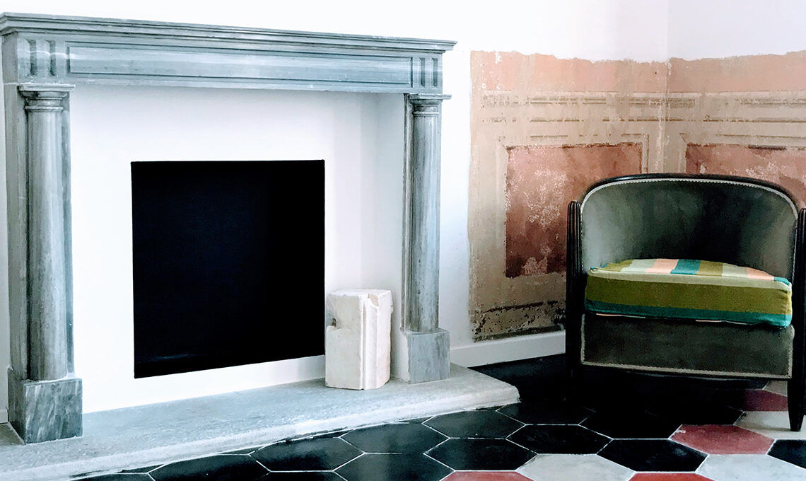 "Il camino è stato una mia aggiunta ma anche la sua provenienza è di recupero! In marmo bardiglio é in stile impero, mentre la beola usata come base arriva da un vecchio balcone".