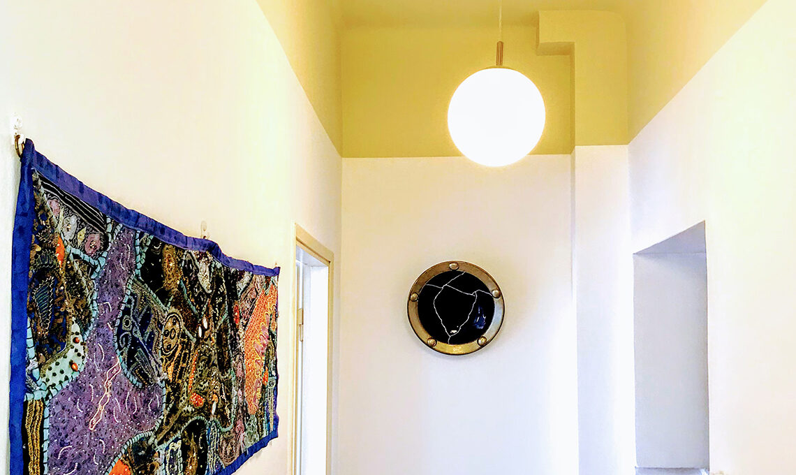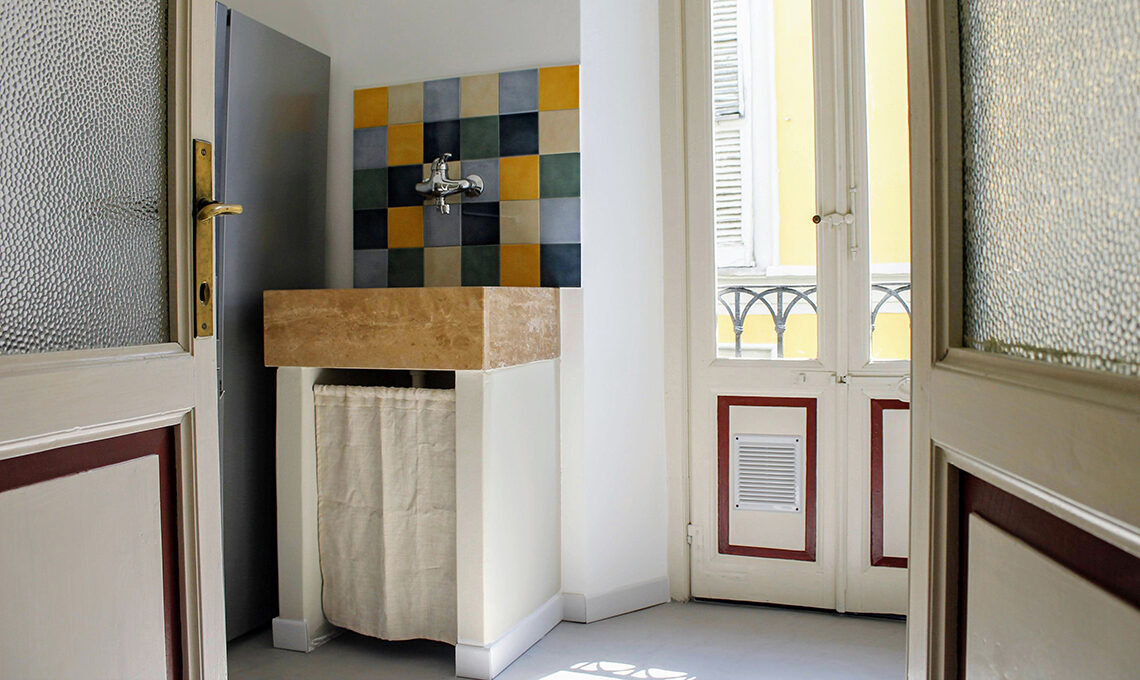 Tanta attenzione per recuperare arredi e riportare allo splendore originario questo appartamento d'epoca, ma anche attenzione a tocchi décor come il soffitto giallo del corridoio che illumina e caratterizza l'ingresso.