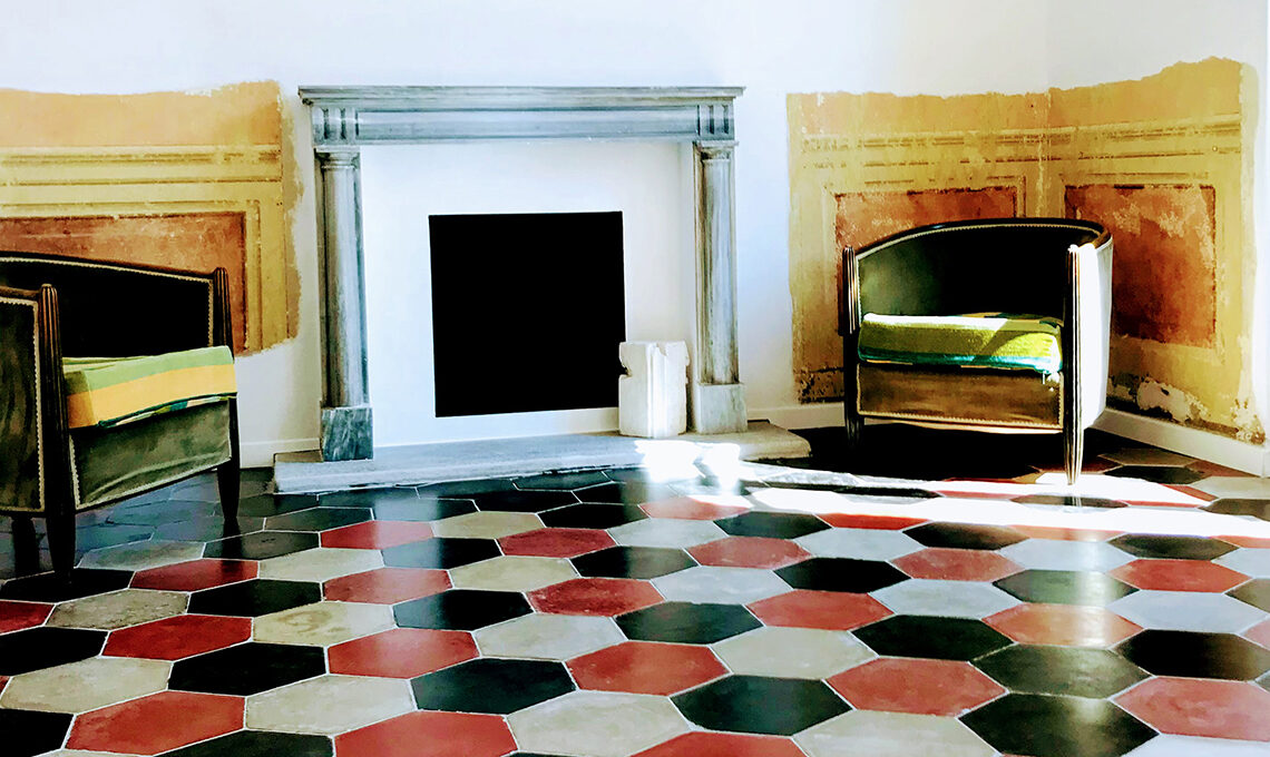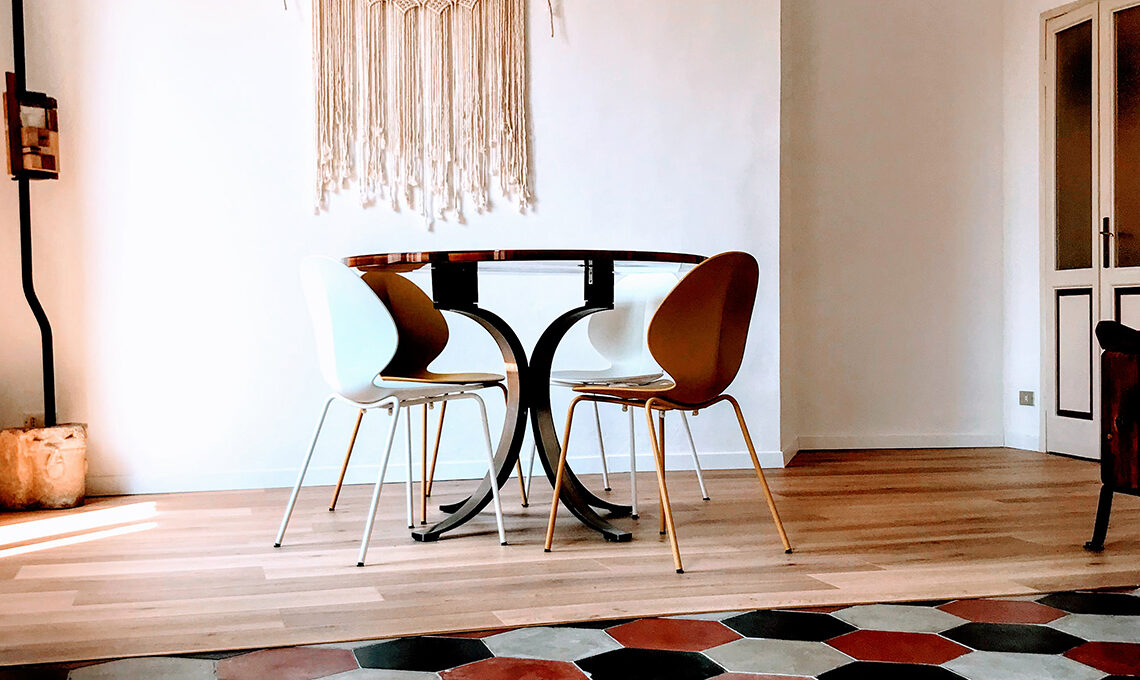 "Quando sono entrato in possesso dell'appartamento in tutta la sala era presente una vecchia moquette e, sotto di essa abbiamo trovato le cementine esagonali originarie." Tolta la moquette è stato necessario consolidare il solaio. Le cementine sono state tolte ma, dopo averle pulite una ad una, riposizionate e riportate al loro antico splendore.