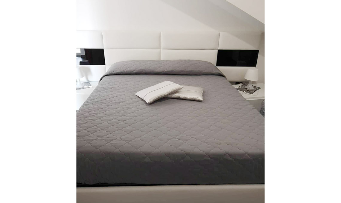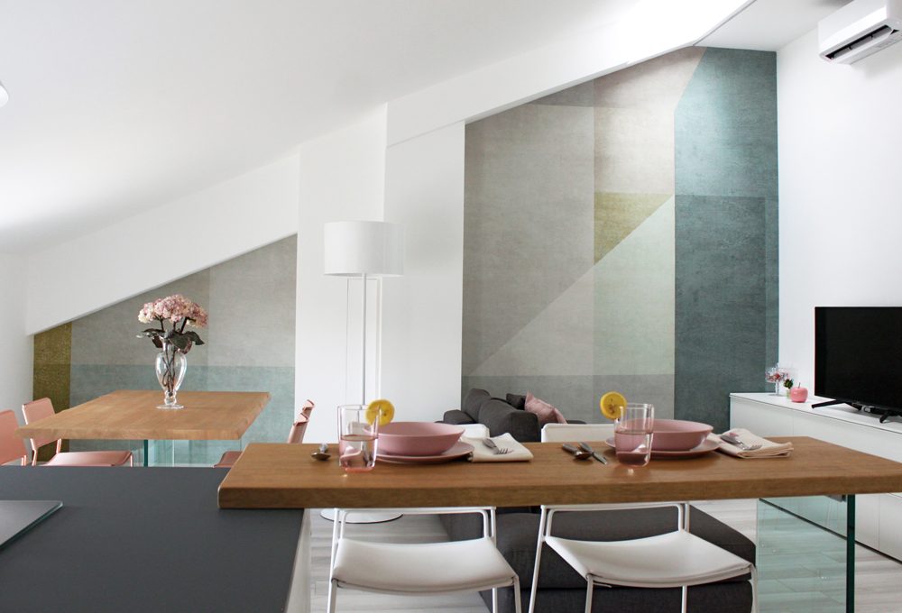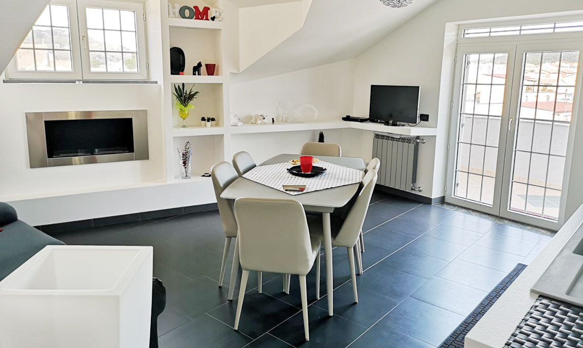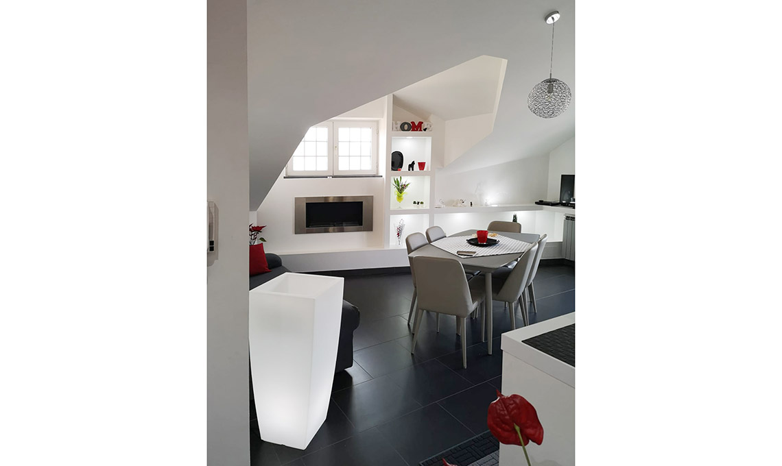Altra caratteristica è sicuramente la struttura della mansarda: 70 mq ristrutturati in stile moderno con un controsoffitto che sfrutta bene le altezze e la disposizione delle zone d'uso. Nella zona giorno dove si trova la cucina a vista, tavolo da pranzo e divano, la parete attrezzata in cartongesso permette di sfruttare lo spazio e include anche un camino a bioetanolo.