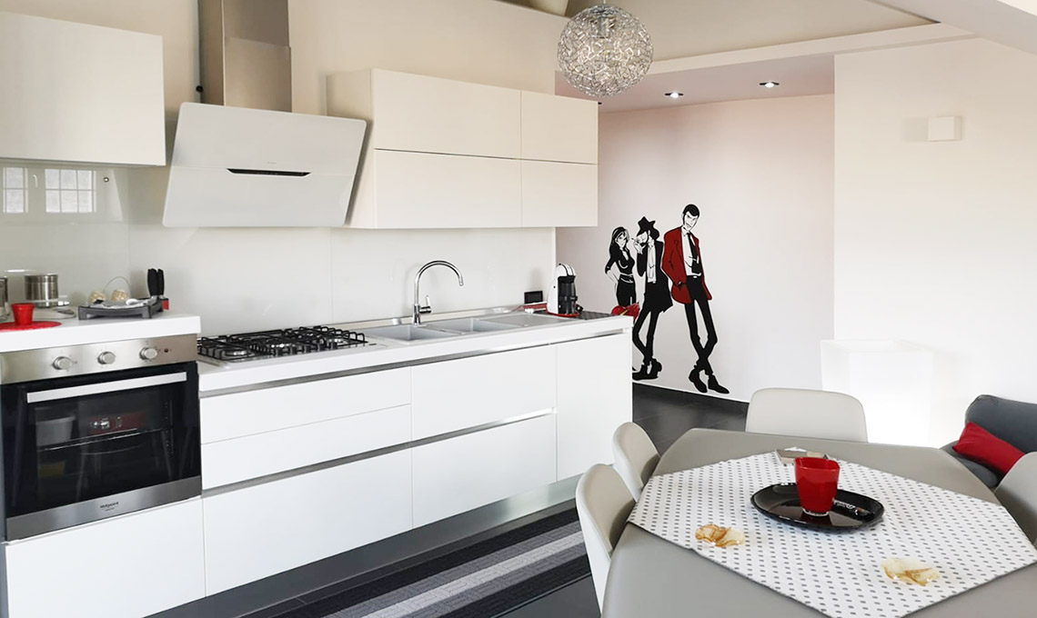 Lupin, Margot e Goemon ci accolgono e introducono alla zona giorno dove una cucina moderna bianca si trova a vista sul soggiorno.
