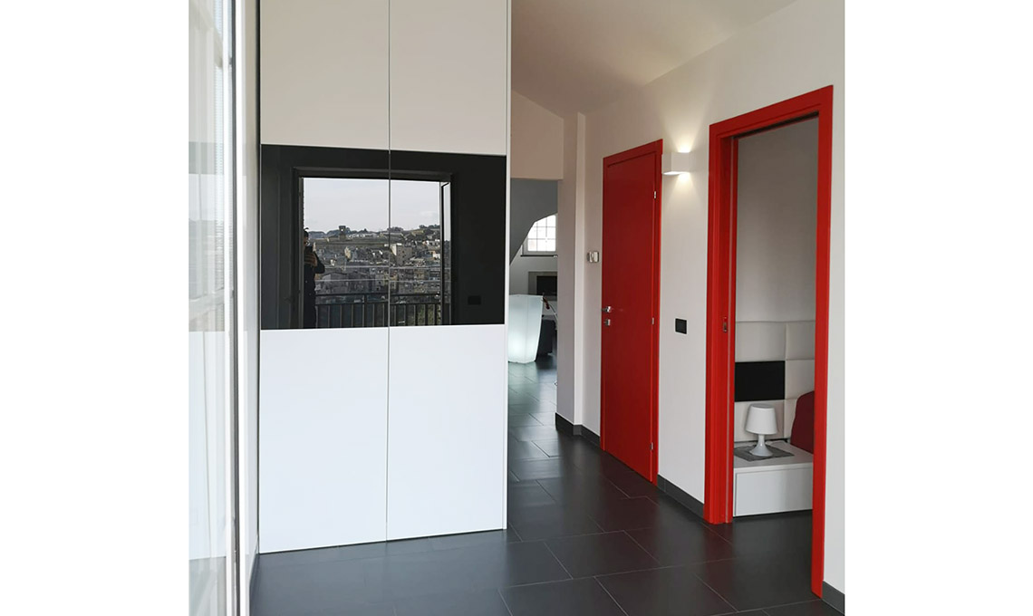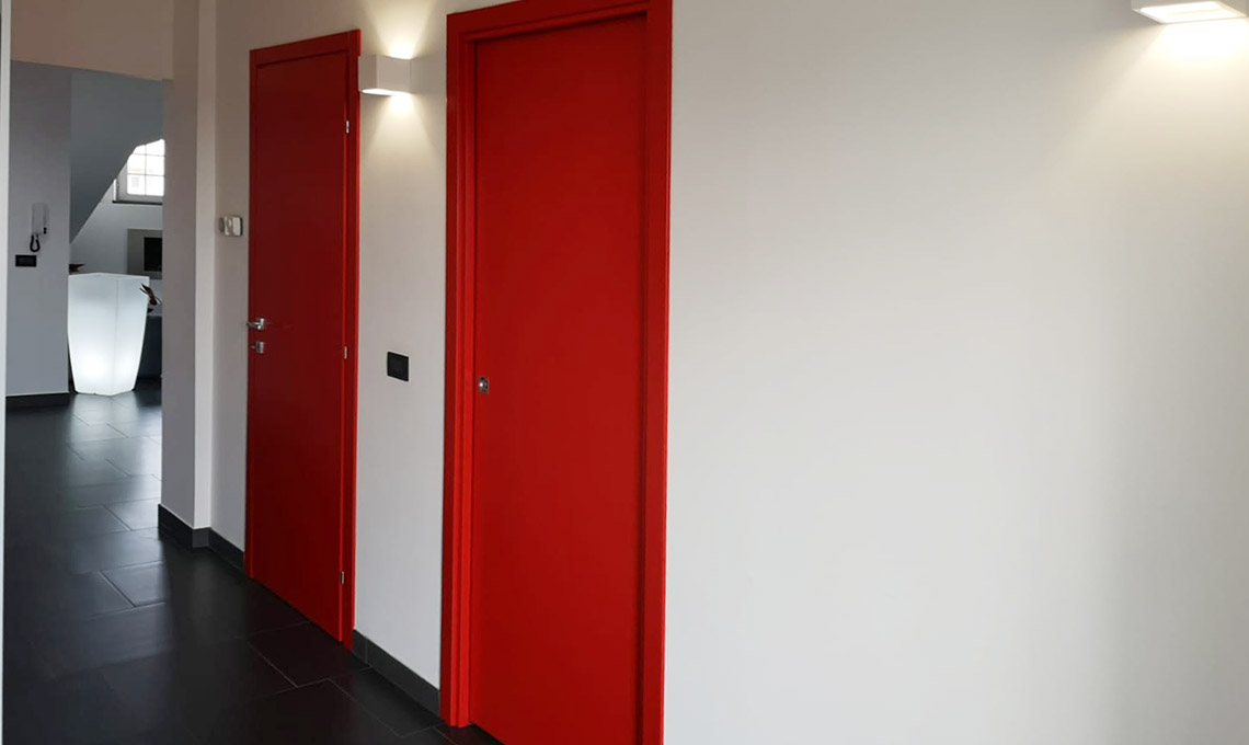 Le porte spesso sono scelte per essere invisibili, presenze silenziosi e funzionali, non in questa casa dove diventano campiture di colore rosso lacca! Un accento ironico e divertente che guida tutta la palette degli accessori di casa e che rispecchia la giovane coppia che qui vive. Le porte colorate diventano elementi fortemente caratterizzanti dello spazio.