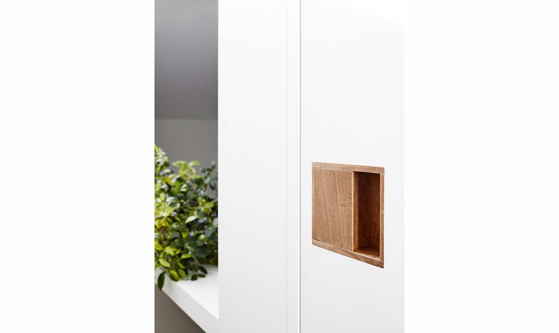 Nella zona notte gli elementi di arredo cercano di massimizzare la diffusione dell’illuminazione naturale inspirandosi al principio del cannon lumière di Le Corbusier, quindi un dispositivo in grado di concentrare la luce e di diffonderla nell’ambiente a seconda delle necessità.