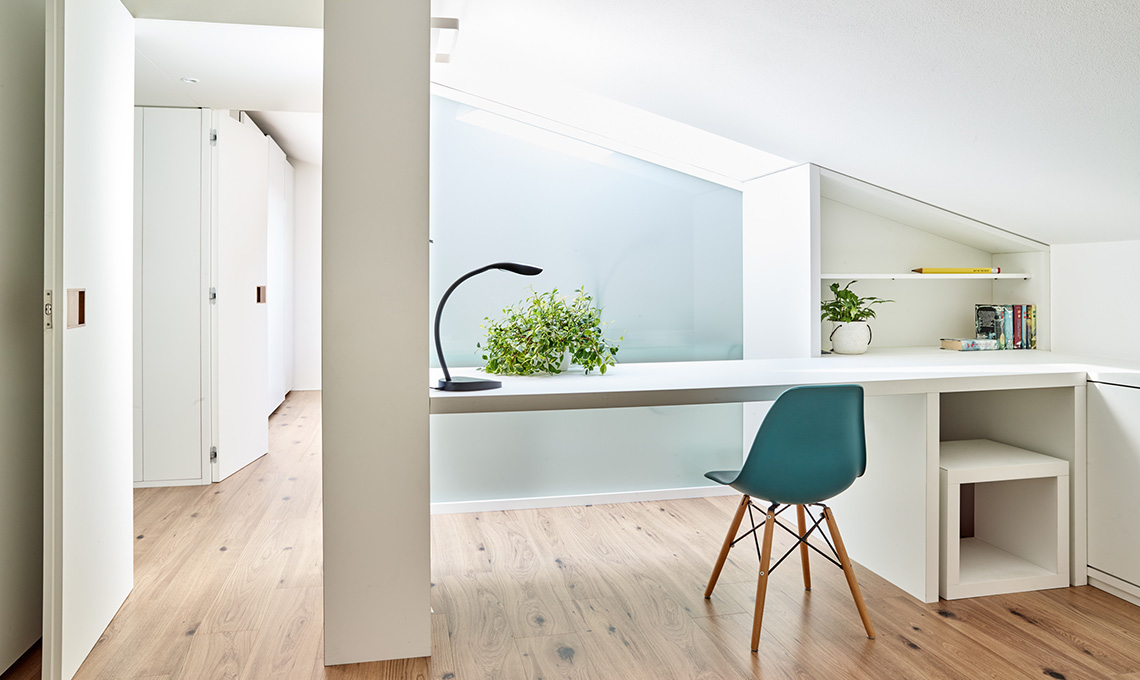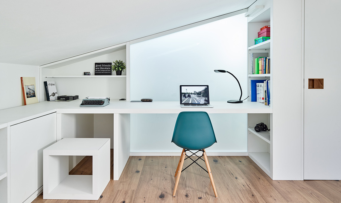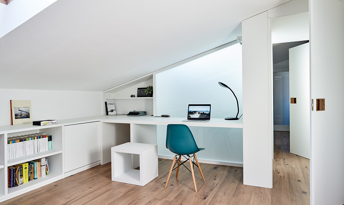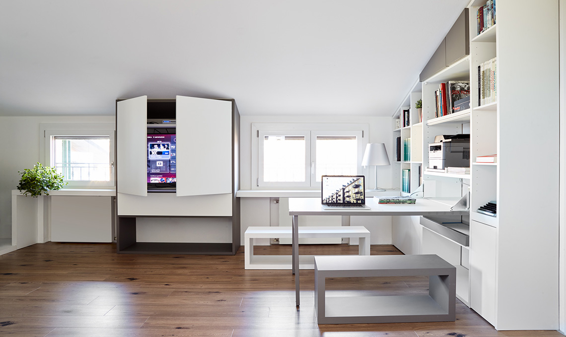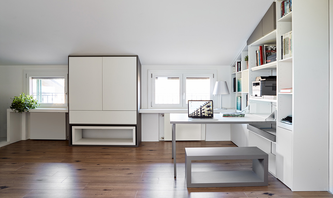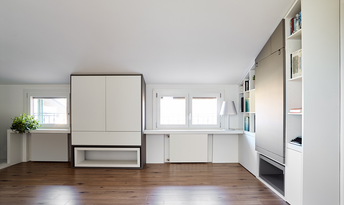 Lo spazio comune a tutta la famiglia è caratterizzato da un unico elemento multifunzionale realizzato su misura [Burgarella Arredamenti] che può assumere diverse configurazioni in base all’attività che vi si svolge: una scrivania a ribalta per lavorare o giocare, una mensola sotto finestra dove poter leggere e il televisore per i momenti di relax.
