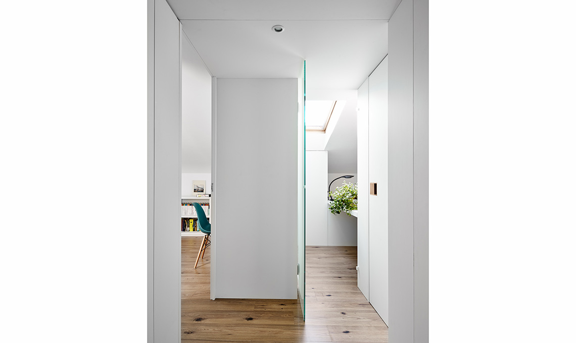 La luce entra dal lucernario centrale in modo diretto per una camera, mentre un vetro bianco filtra l’illuminazione dell’altra camera e del disimpegno d’ingresso.