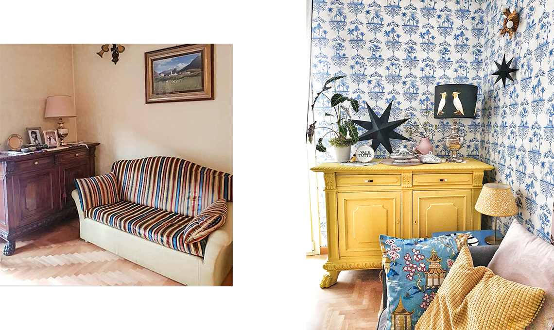 La conversione della mia zona living dallo stile classico all’eclettico è partita da questo mobile di famiglia, un esempio di ‘barocco bolognese’ in voga tra fine ’800 e primi ’900. Per alleggerire, mi sono detta, serve del giallo (è smalto all’acqua satinato dato a spruzzo) e due maniglie prese a Mercatopoli Bologna Porto. Ho poi giocato con lo styling. Ricordavo una bellissima carta da parati che avevo visto su CasaFacile, Folie Rousseau di Cole & Son, con i miei amati motivi ‘toile de jouy’, ma resi ironici con zebre, giraffe e scimmie, che parlano del mio amore per l’Africa. Altri dettagli? I cuscini sono di Ikea e Leroy Merlin; gli uccellini e le tovagliette rotonde sono del Borgo delle Tovaglie di Bologna, le stelle di carta nere le ho fatte io, il vaso rosa è di Ikea e il piattino ‘Vale tutto’ di Bitossi Home esprime bene il mio stile di arredo!».