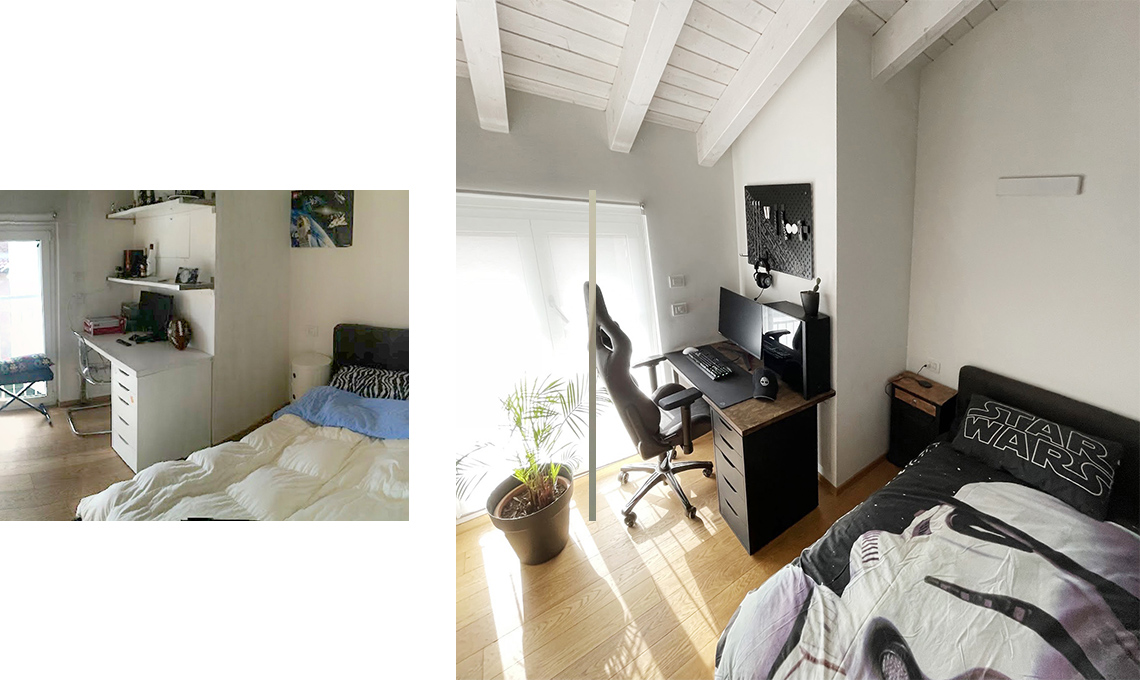 Per il figlio ventenne, Amanda Deni ha dato alla stanza un look più industrial e funzionale (la sedia ergonomica, la bacheca).