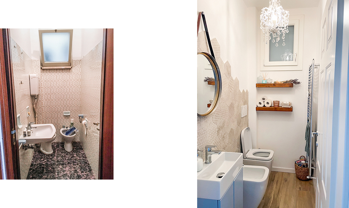 «Da piccola ho cambiato spesso casa per il lavoro di mio padre, e aiutavo mia madre nei tocchi décor. Così è nata la passione per i relooking. Il mio bagno piccolo (m 2x1), che aveva le piastrelle nere e fucsia e i sanitari ‘storti’, è stato una sfida. Contro il parere dell’idraulico, ho inserito anche il bidet (i sanitari sono serie Stone di Ceramica Globo, cm 45x36). Per ricordare la Sicilia, dove ho abitato, ho scelto piastrelle esagonali disposte a onda; per ricordare la montagna (altra mia passione, che mi ha fatto incontrare l’amore) ho chiesto al nonno due mensole di legno per cui ho preso spunto da Pinterest».