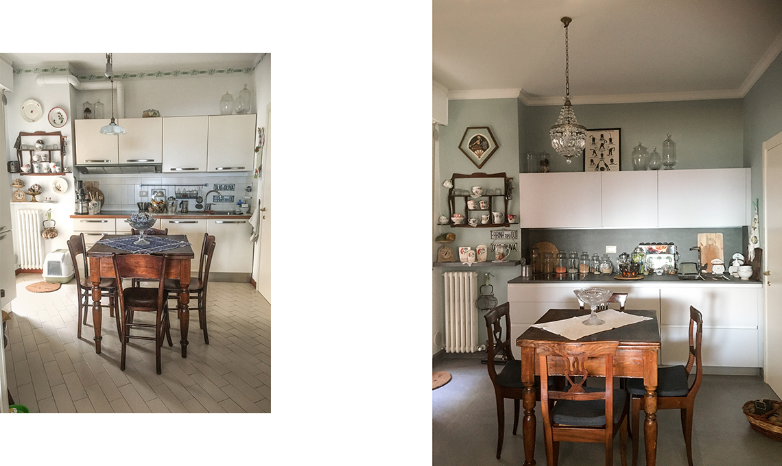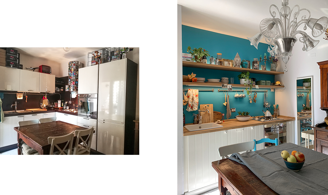«Vivo in Medio Oriente dove tutto ha le nuance della sabbia, io che amo i colori! Abbiamo un piccolo appartamento a Riccione per le vacanze, e lì mi sono sbizzarrita. La vecchia proprietaria ci ha lasciato una cucina anonima e troppo ‘invadente’. L’ho ridotta senza rinunciare a due mensole dove esporre le mie collezioni. Volevo un posto tutto mio dove potessero convivere il disordine o l’ordine a seconda dell’umore; dove riporre anche i miei ricordi dì viaggio. Inoltre volevo fare spazio a una vecchia vetrina dì famiglia. Non ho usato piastrelle ma uno smalto opaco lavabile che dà un bel tocco dì colore. Il tavolo vintage è XL ma ci tengo molto ed è il fulcro della cucina».