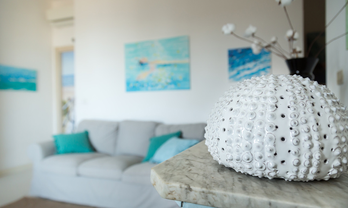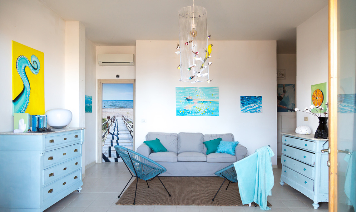 Il soggiorno è il cuore pulsante della casa, non è sovraccarico di mobili, c’è solo l’essenziale: i quadri che decorano le pareti rappresentano i riflessi della luce sul mare, i tentacoli del polipo e alcuni particolari di conchiglie.