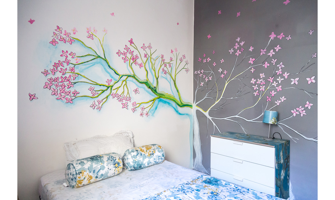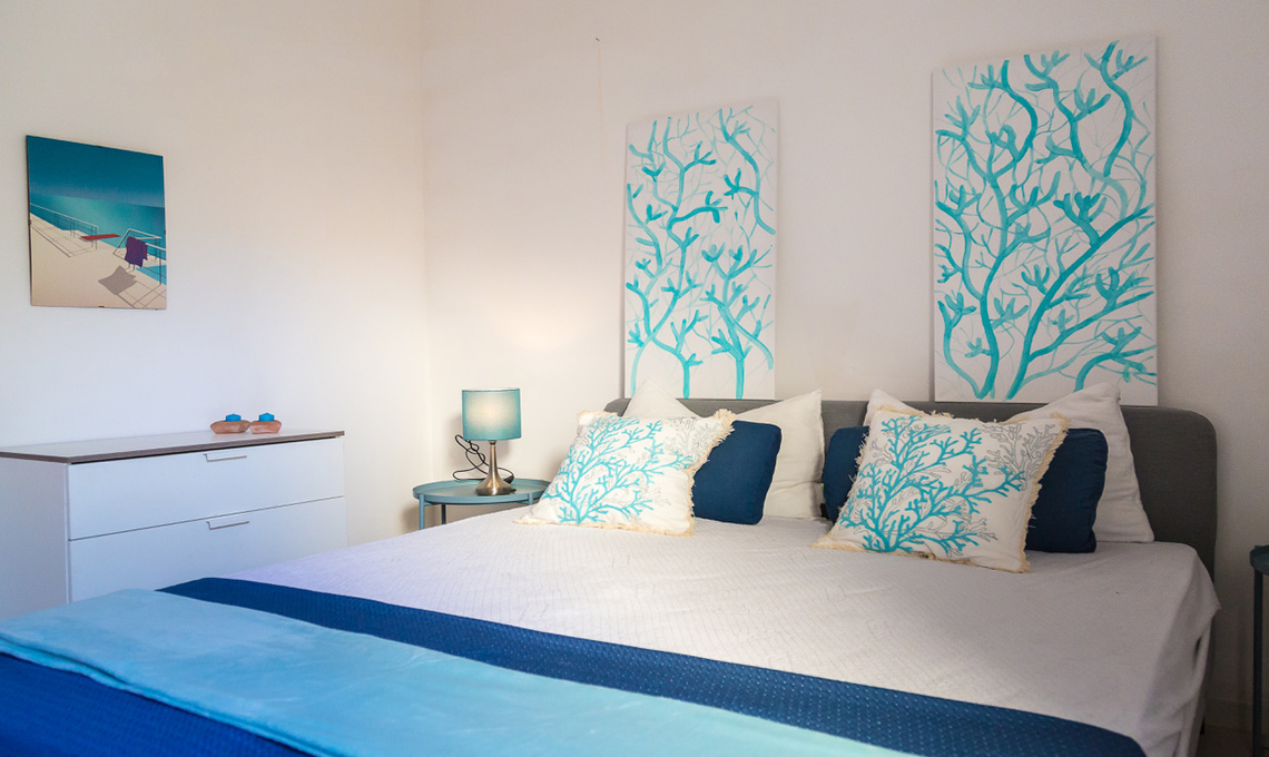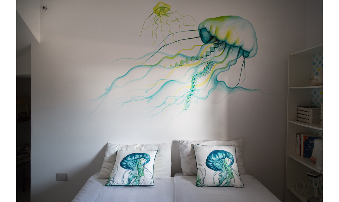 Le pareti delle camere da letto sono state decorate con elementi diversi: la medusa, il corallo e l’albero; ho cercato di recuperare alcuni complementi di arredo che potessero abbinarsi alle decorazioni, come cuscini e copriletti.