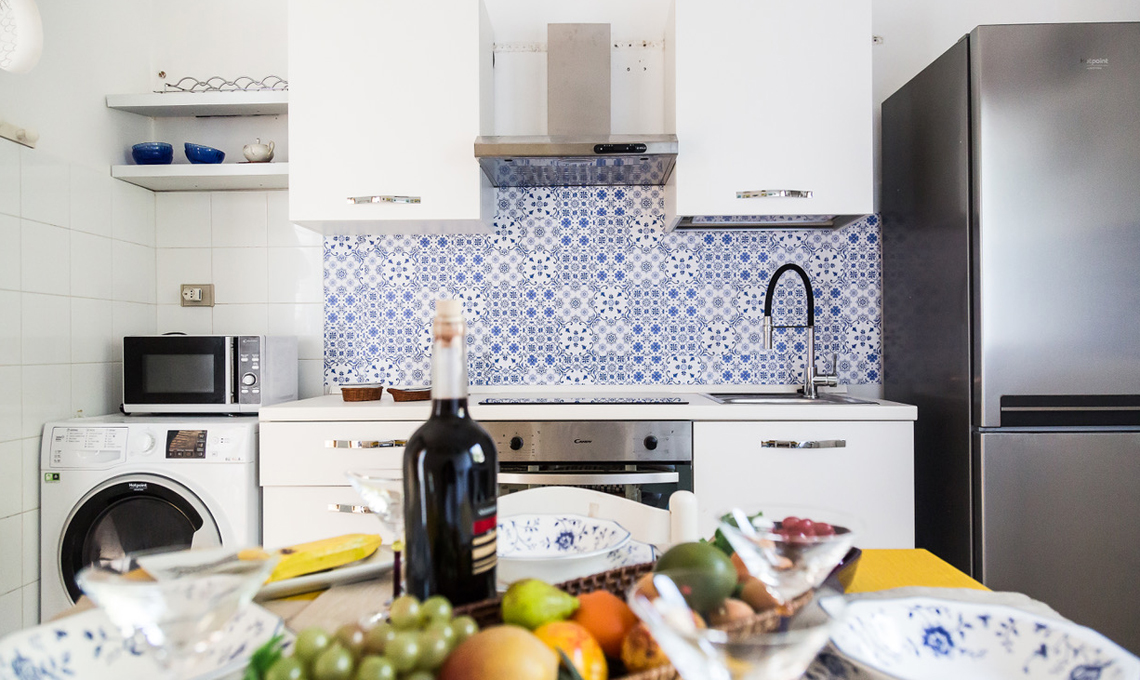 La cucina è stata arredata con dei mobili moderni e sulle pareti sono stati appesi dei piatti e quadri che ho decorato a mano.