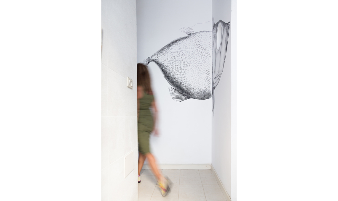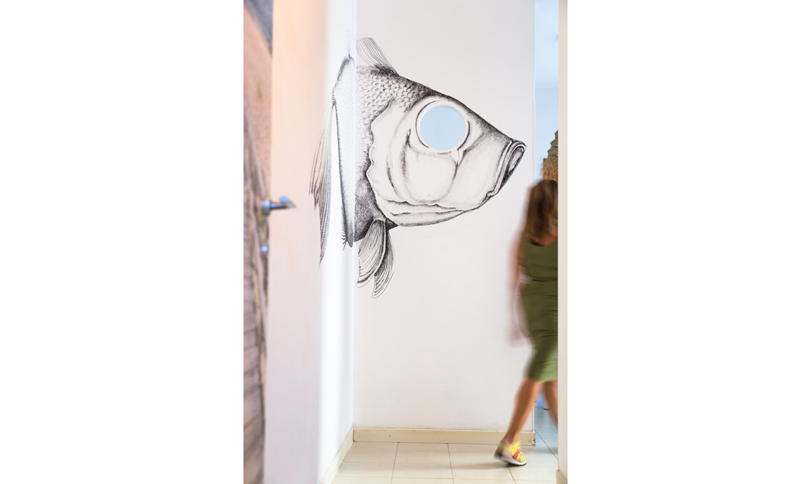 Il corridoio che collega il salotto alla cucina, è volutamente privo di mobili perché l’attenzione si deve focalizzare sul grande pesce che ho dipinto attorno ad una piccola finestra circolare.