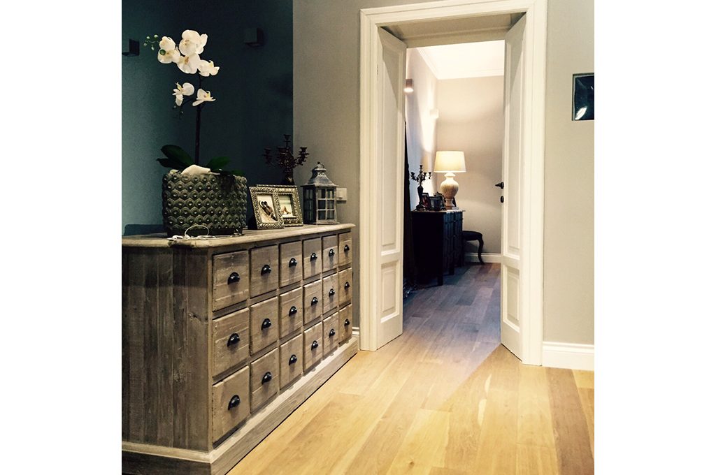 Il pavimento della casa è stato uniformato con un parquet rovere effetto fumo Londra. Si è deciso di lavorare sui contrasti mantenendo quelle che erano le modanature in gesso pre-esistenti.