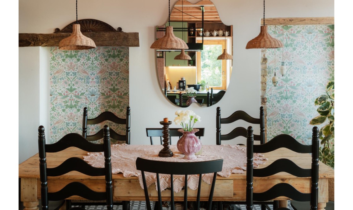 Recuperare è un’arte: qui in cucina, sedie di famiglia, il tavolo arriva dalla comunità Emmaus, lo specchio da una casa abbandonata, e la madia è stata dipinta di resina nera.
