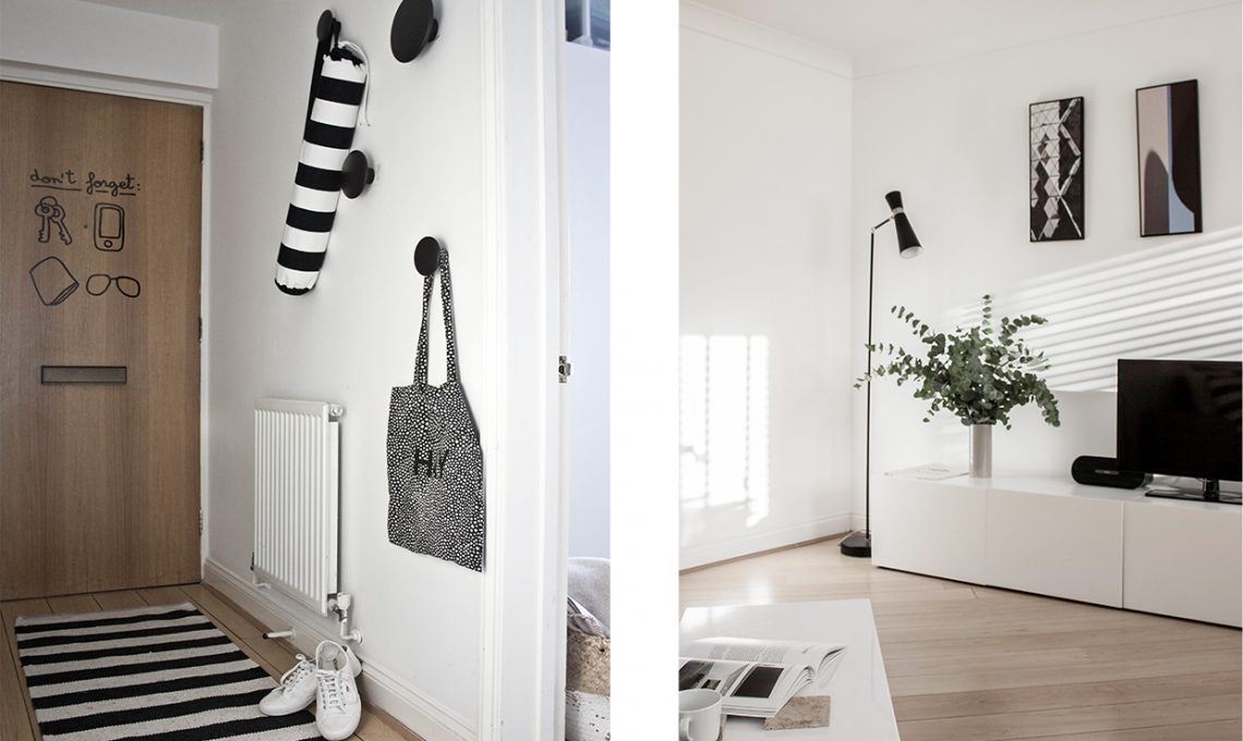 L'ingresso è il trionfo del bianco e nero. Trattandosi di uno spazio piuttosto stretto, ho cercato di renderlo accogliente e simpatico, con gli appendini Dots di Muuto, un tappeto a strisce bianco e nero e lo stickers ‘Don't Forget’ sulla porta (che non è stata cambiata). L'illuminazione e' fornita dalla lampada da soffitto stretta e lunga Toy di Panzeri (perfetta per i soffitti non troppo alti degli appartamenti inglesi).