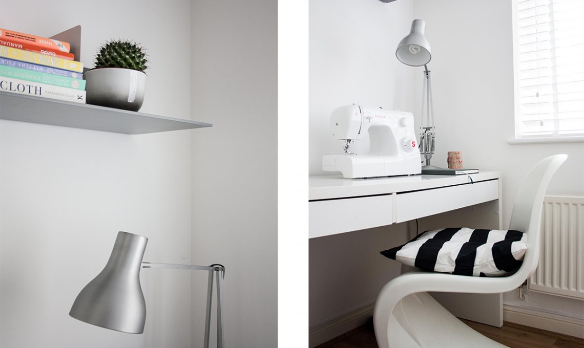 Lo studio si trasforma velocemente e felicemente in un delizioso ambiente dedicato ad uno dei miei hobby preferiti un po' vintage ed un po’ fuori dal comune: il cucito. Qui mi rinchiudo con piacere godendo di questo mio questo passatempo, senza dimenticare un tocco di design: la lampada Anglepoise e la mensola Profil di E15 entrambi di colore grigio, che alleviano il look total white della stanza.