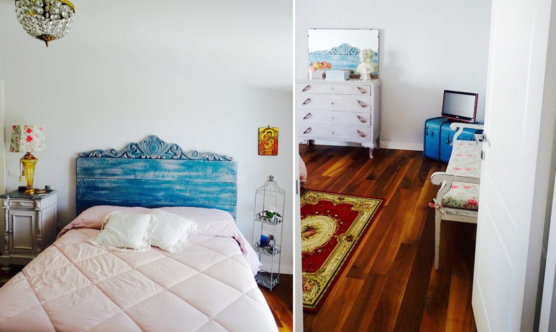 Anche la camera da letto è realizzata con mobili antichi decapati tranne la testata del letto che è stata creata con tavole da ponteggio ed una vecchia cimasa a completamento del tutto. A un lato del letto al posto del tradizionale comodino vi è una una fioriera in ferro battuto a tre livelli."